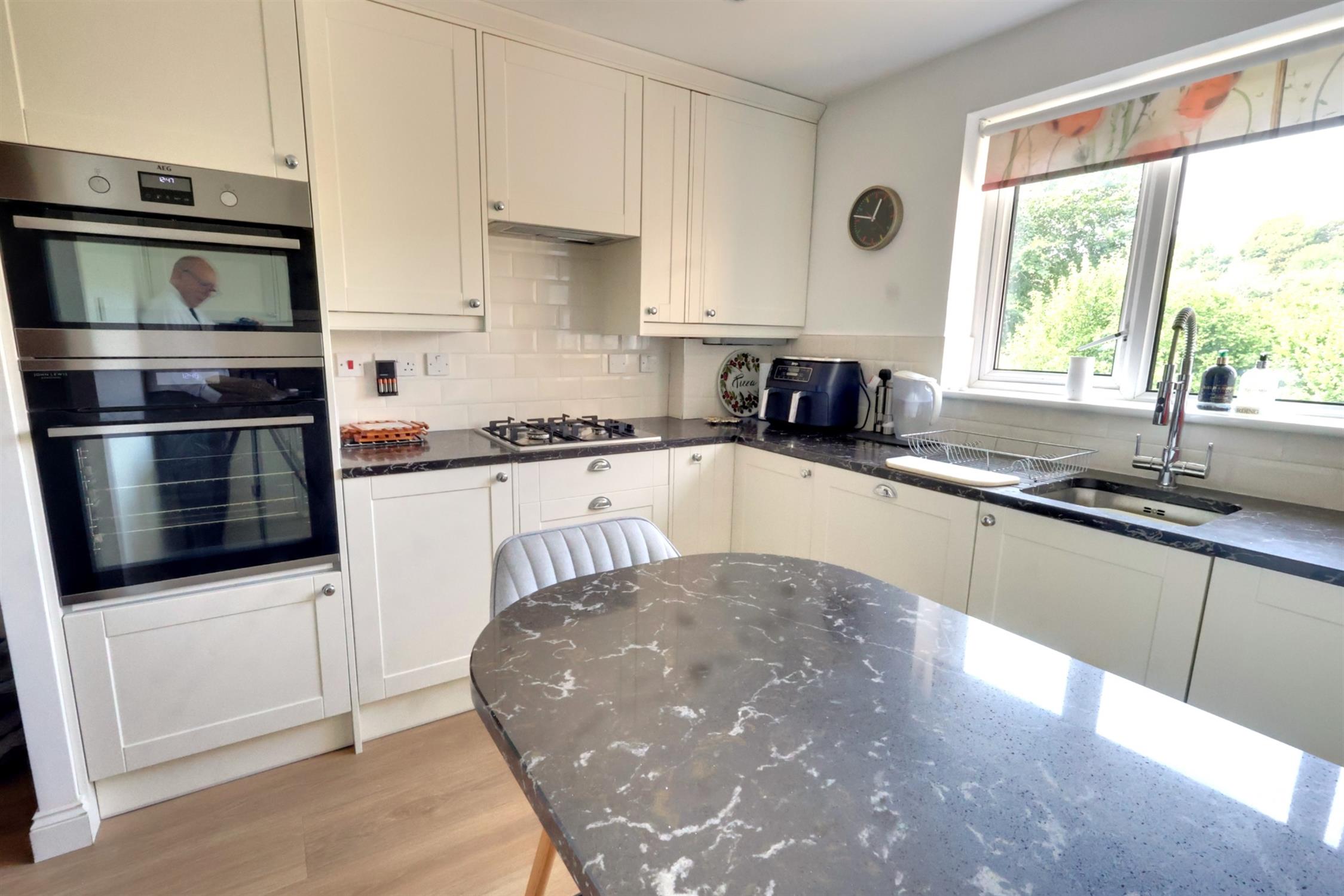 Double glazed window with countryside views to rear. Extensive range of fitted floor and wall units with contrasting work surfaces and complimentary tiling to walls. Inset sink unit with mixer tap over. Four ring gas hob with concealed extractor. Eye level double oven. Integrated dishwasher. Peninsular breakfast bar. Concealed Baxi wall mounted gas fired boiler.