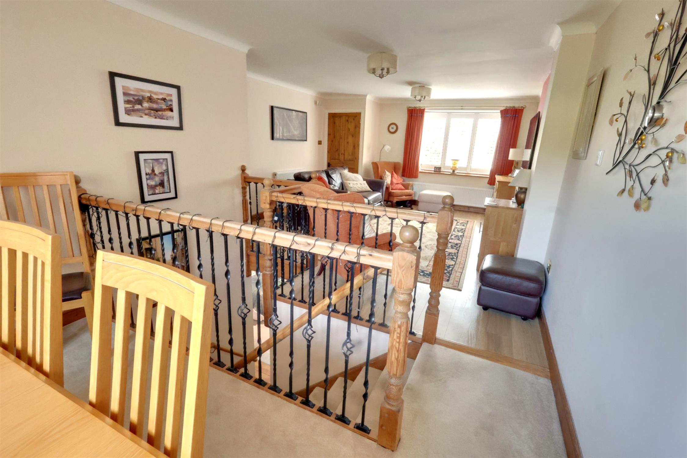 Most attractive twin aspect double glazed room with fittted window shutters and countryside views to rear. Set around feature fire surround with timber mantle and stone hearth. Television point. Two radiators. Ornamental balustrade and stairs down to lower ground floor.