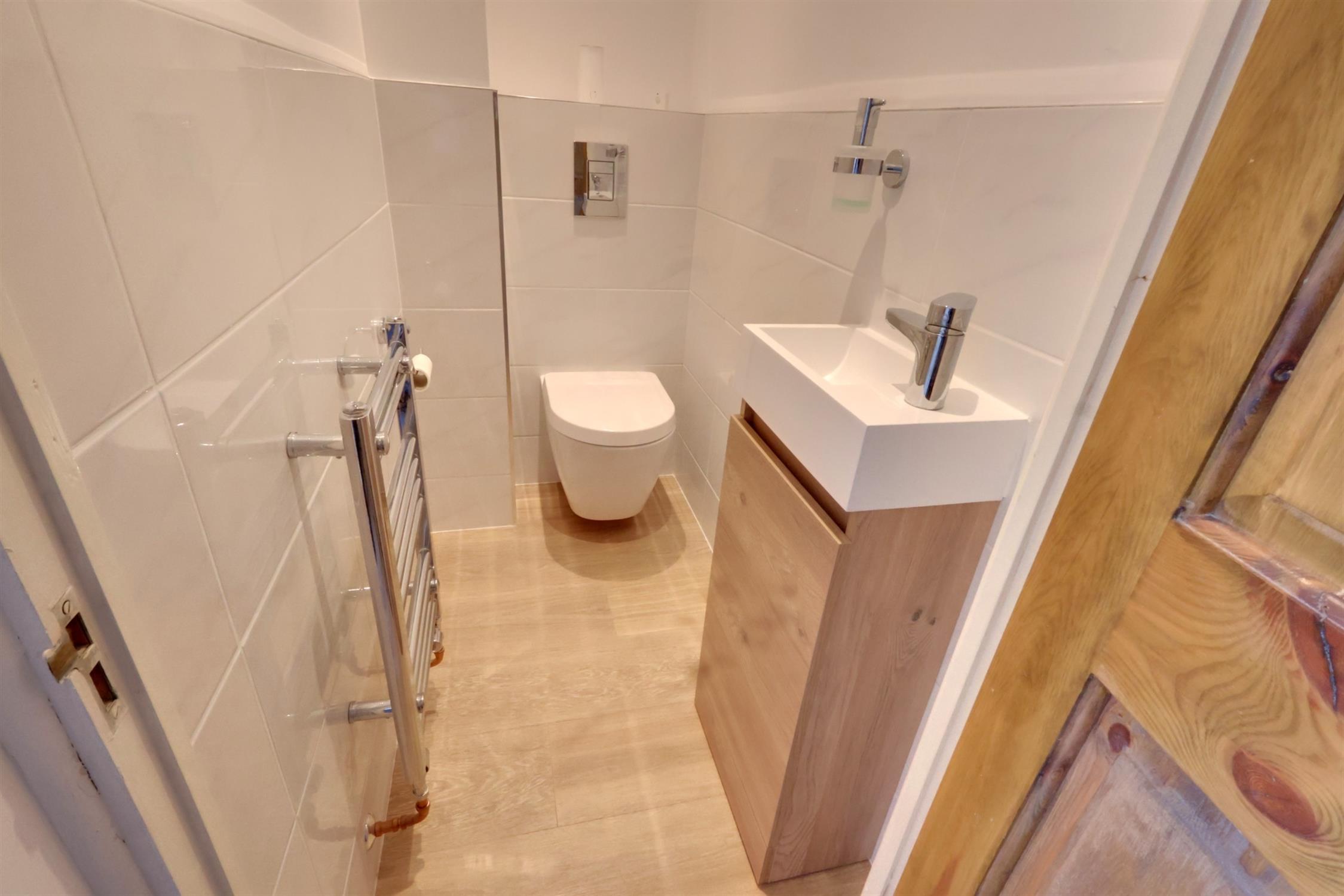 Luxury refitted suite comprising wall hung close couple WC. Hand basin with cupboard below. Ladder radiator. Half tiled walls. Extractor fan.
