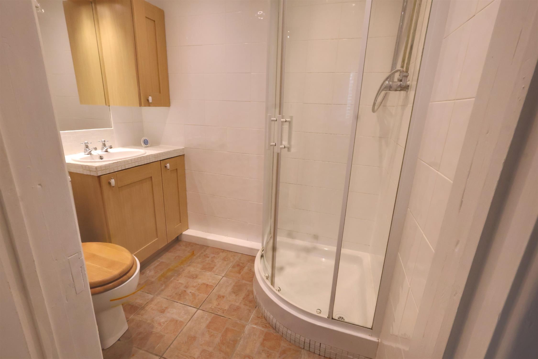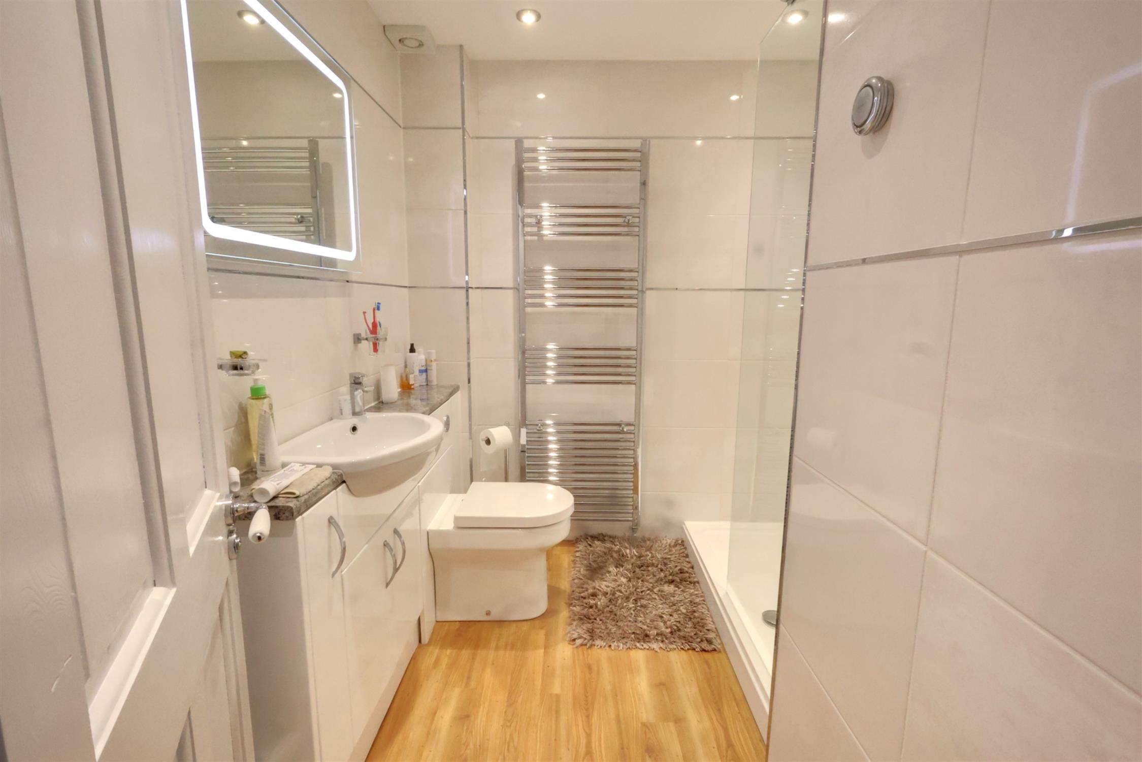 Fully tiled. Luxury suite comprising step in corner shower cubicle. Low level WC. Hand basin set in vanity cupboard. Wall mounted cabinet. Ladder style radiator.