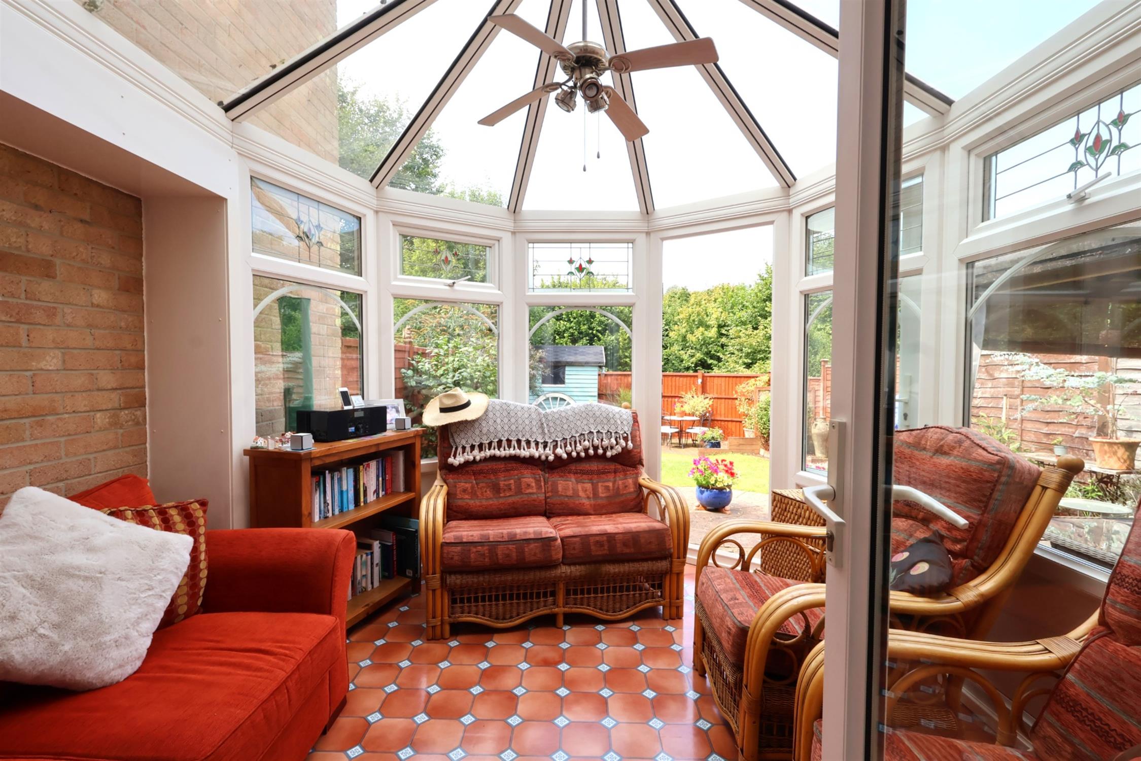 Double glazed Upvc construction with vaulted glass ceiling. Ceiling light and fan with lead light openings. Door to garden.