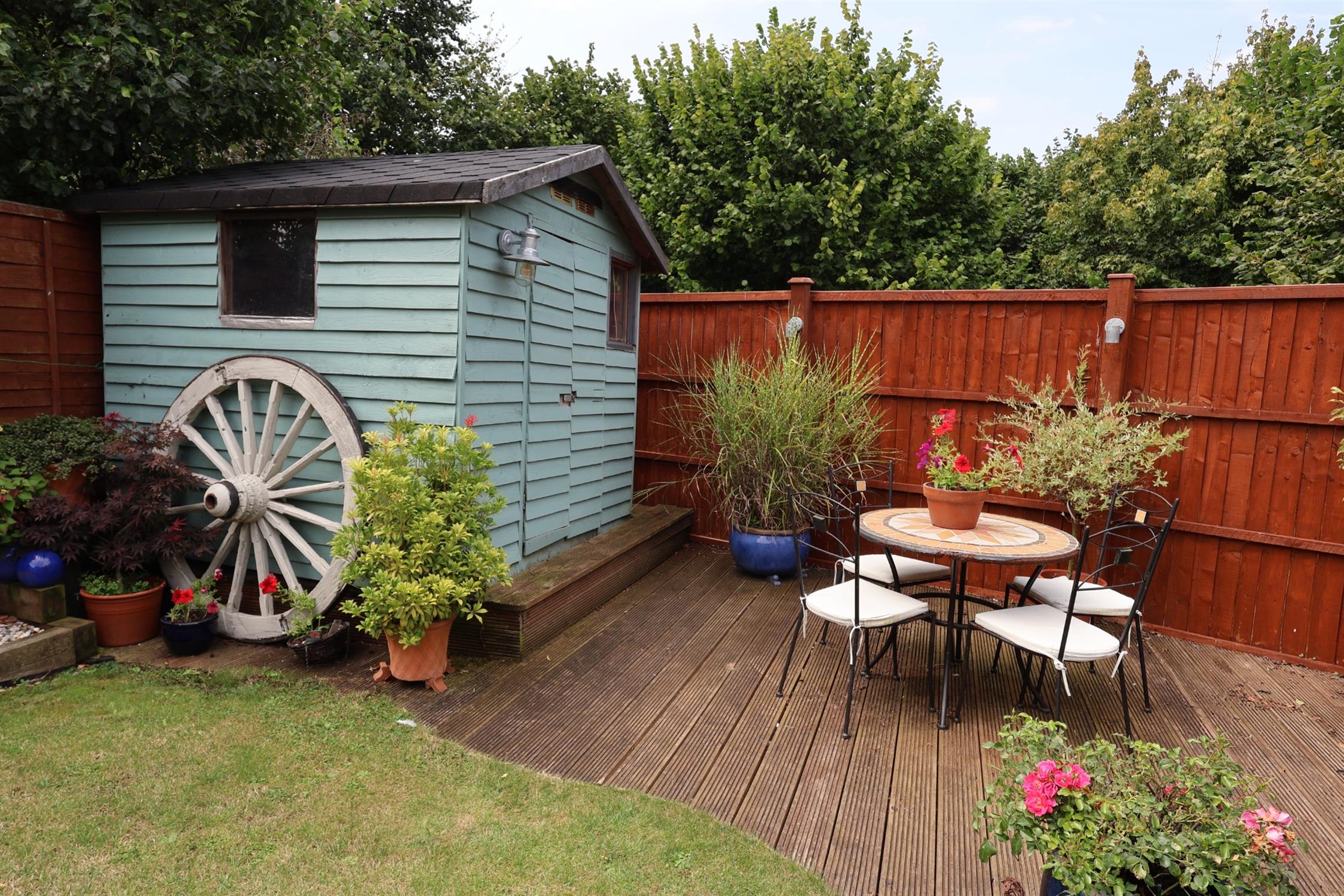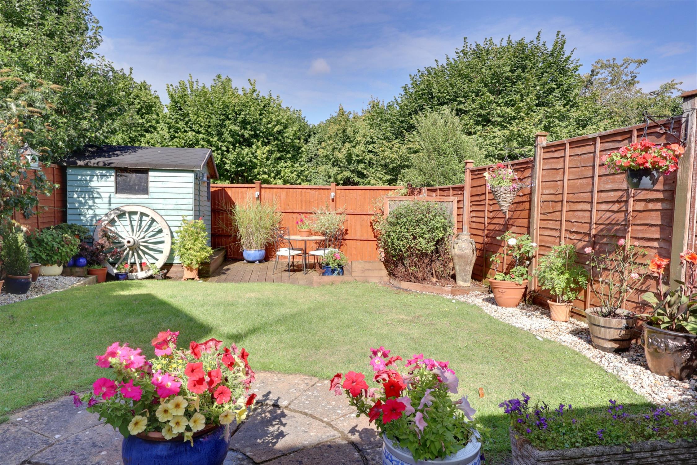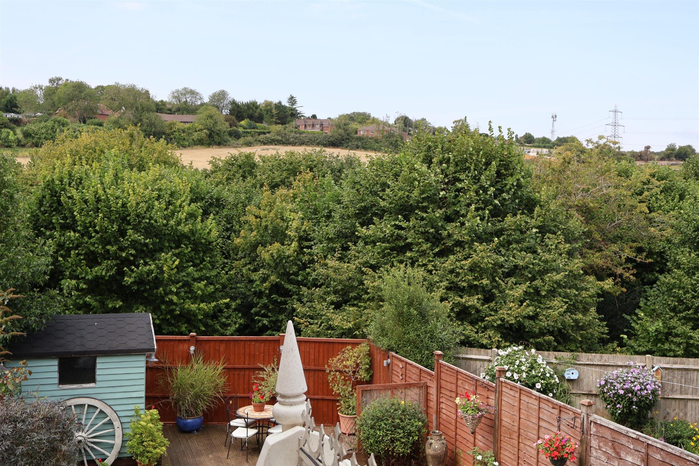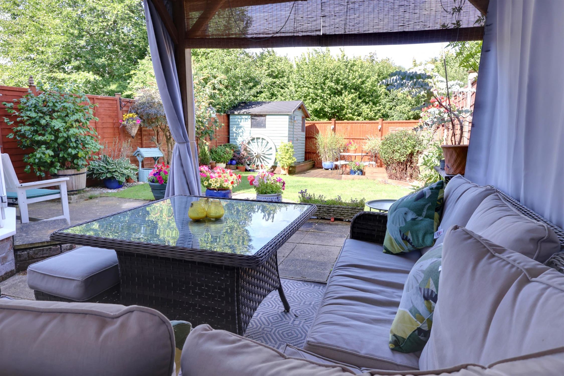 A most attractive garden fully enclosed with views of countryside. Lawn with colourful well stocked flower border. Paved patio areas.Timber garden store further seating area with garden lighting. Outside tap, power point.