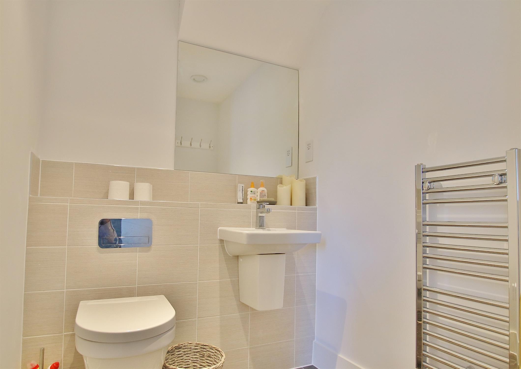 CLOAKROOM – Partially tiled walls, heated towel rail, wash hand basin, low level W.C with dual flush Extractor fan.