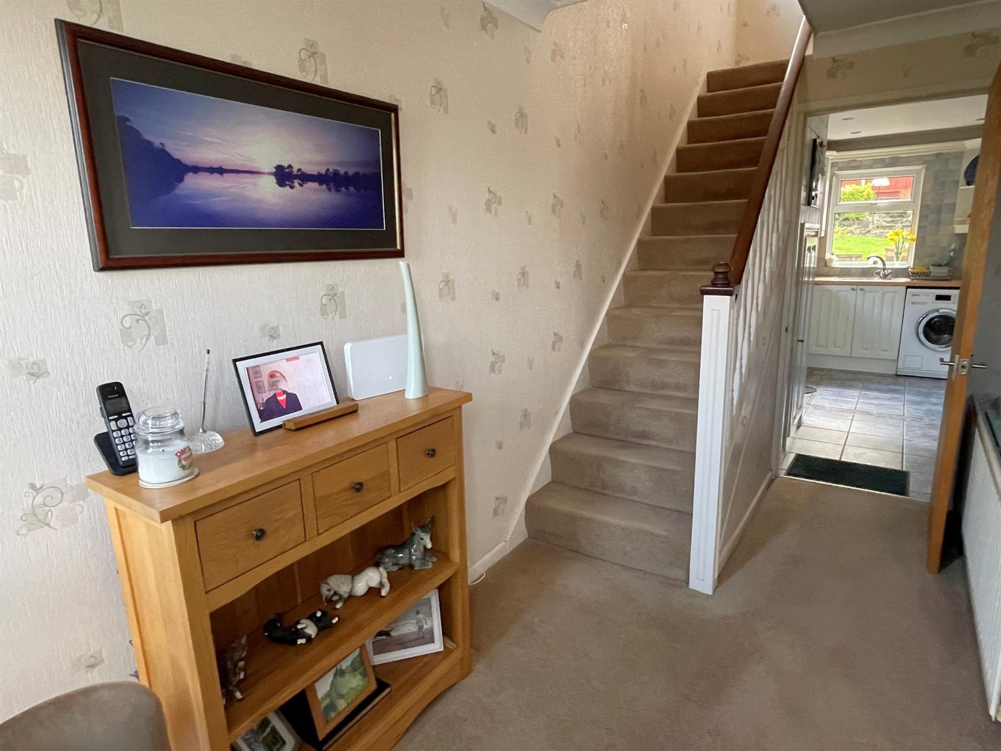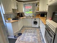 Window to rear. Range of wall and base units with work surfaces over. One and a half bowl stainless steel sink unit. Tiled splashbacks. 4 ring gas hob. Built in electric oven. Space for microwave. Space and plumbing for washing machine. Space for fridge freezer. Built in storage cupboard. Door to garden.