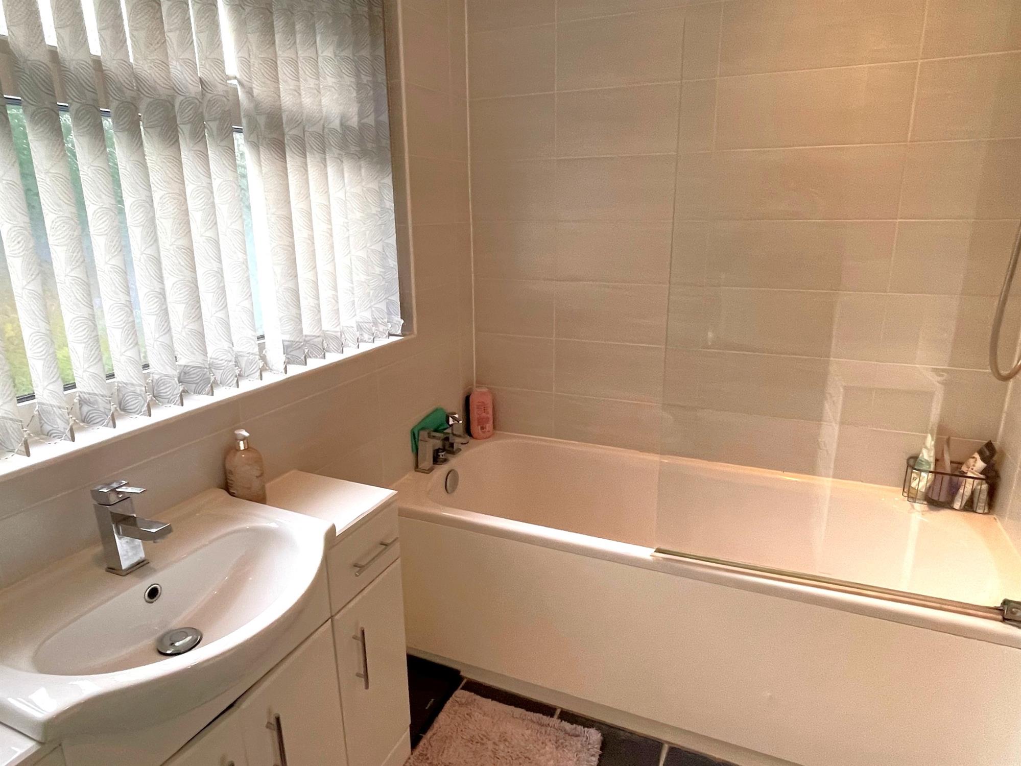 Window to rear. Low level WC with concealed flush. Inset wash hand basin with cupboard below. Panelled bath with shower over. Complementary tiling. Fitted storage. Heated towel radiator.