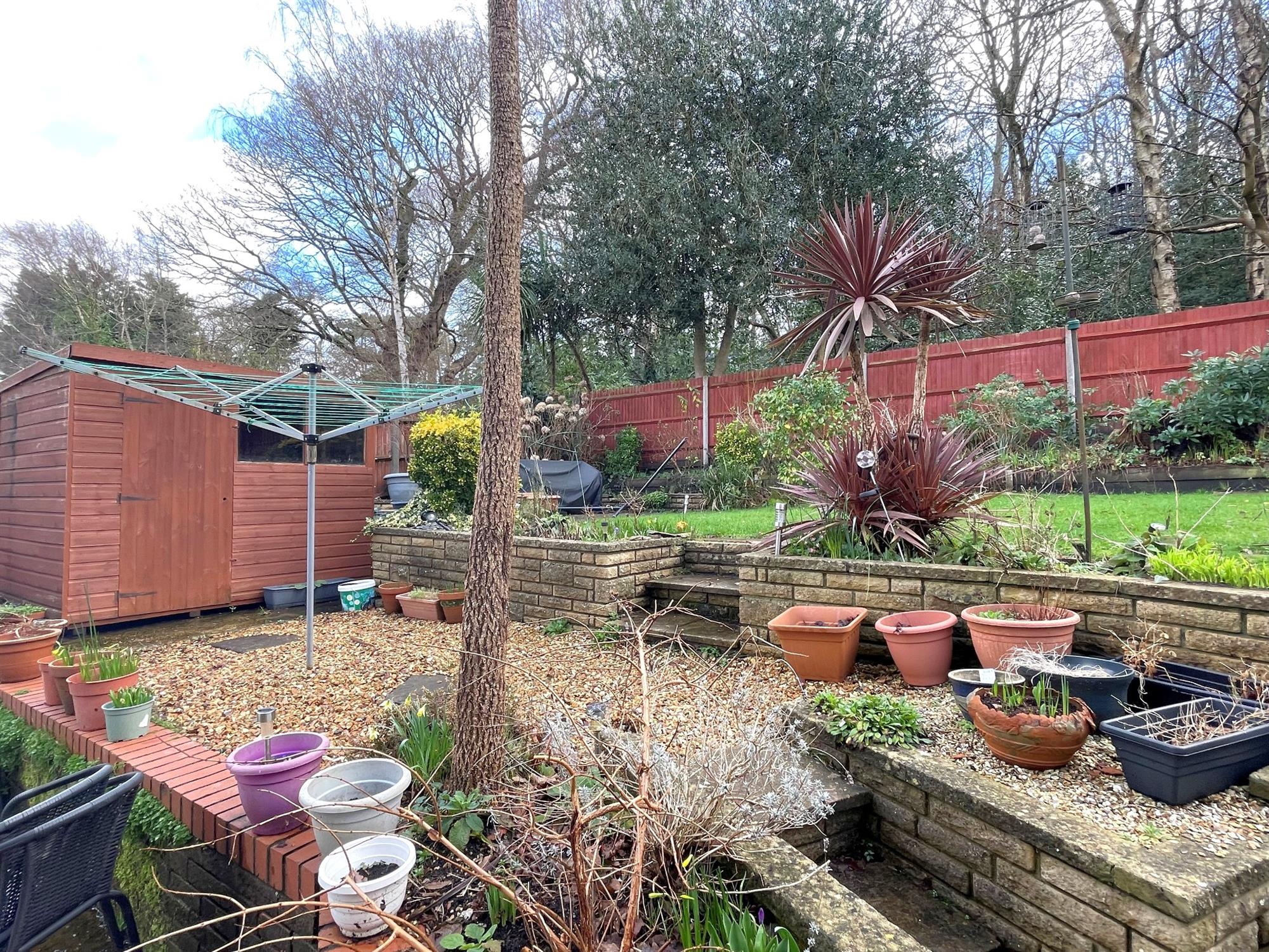 Fenced to boundaries backing onto Woodland. Steps to shingle area with shrubs to borders. Steps to lawn area with raised seating area. Timber garden shed. Pedestrian side access.