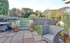 Limestone paved patio. Feature stone walling. Laid to lawn. Steps to further lawn area with shrubs, bushes and hedging to boundaries.