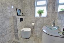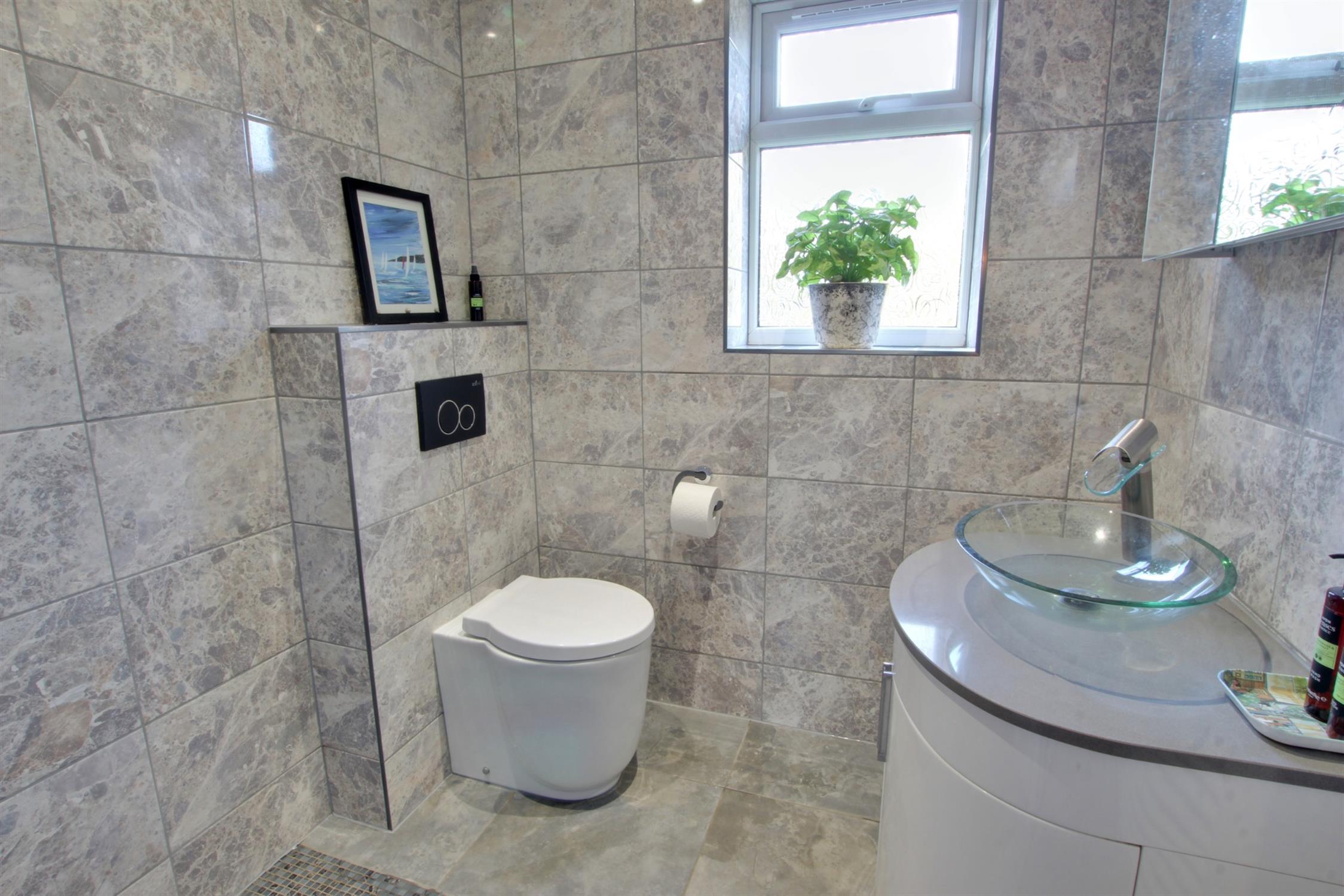 Window to rear. Low level WC with concealed flush. Vanity unit with glass bowl sink. Shower connected. Fully tiled. Heated towel radiator.
