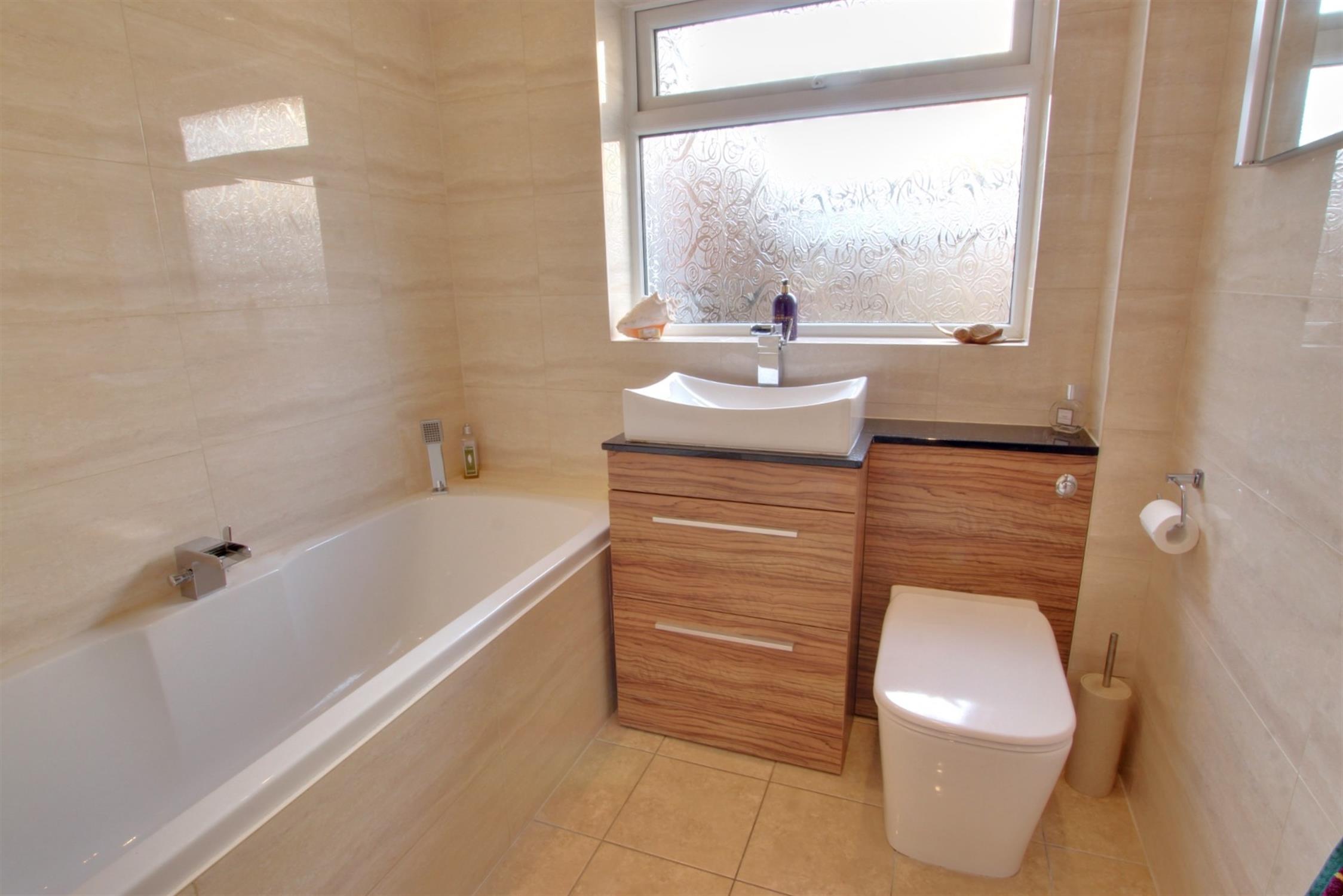 Window to side. Panelled bath with central tap. Low level WC with concealed flush. Inset wash hand basin with drawers below. Vanity unit. Complementary tiling. Tiled flooring. Heated towel rail.