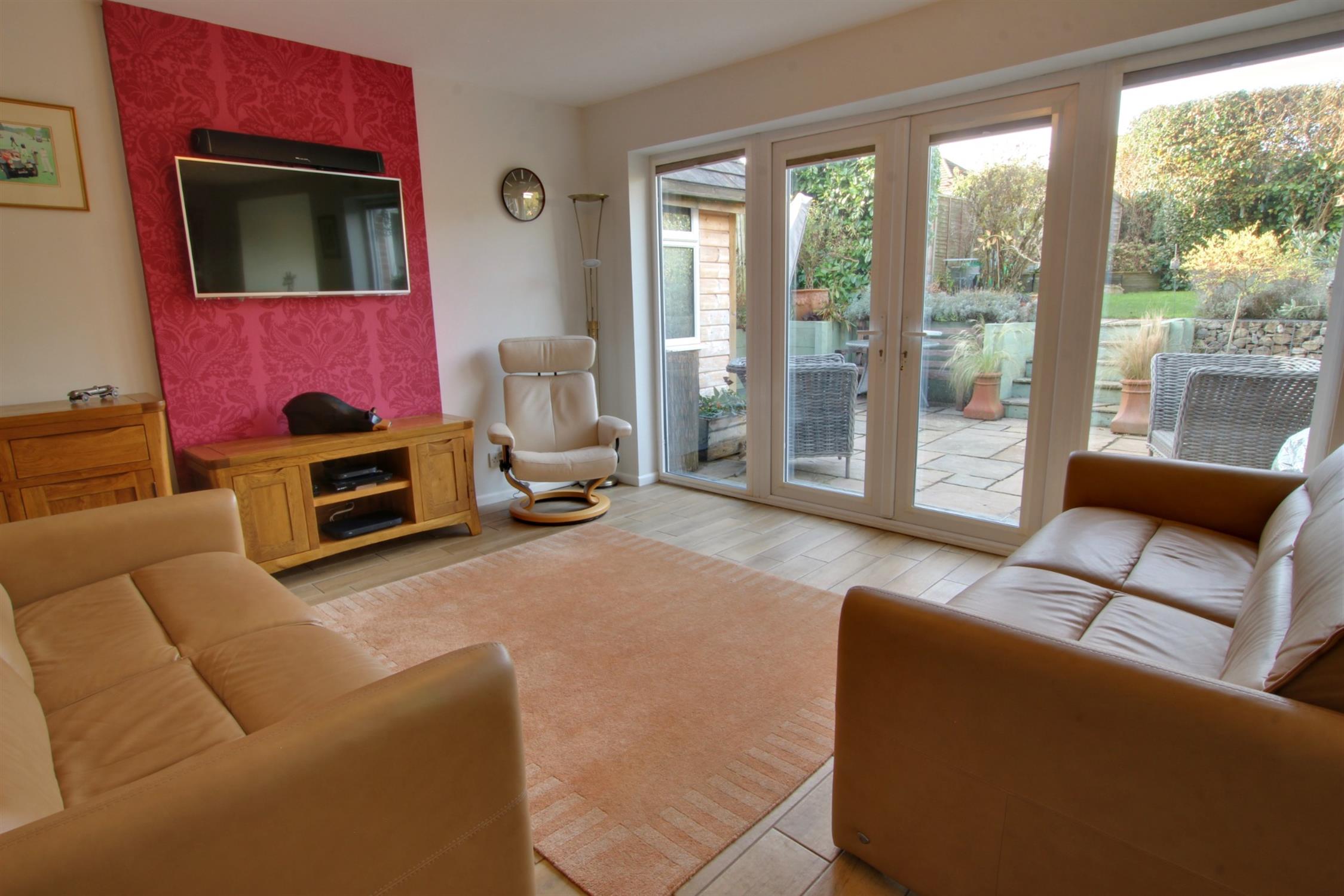 Full length windows and double doors to garden. Television Point. Porcelain wood effect flooring. Radiator.