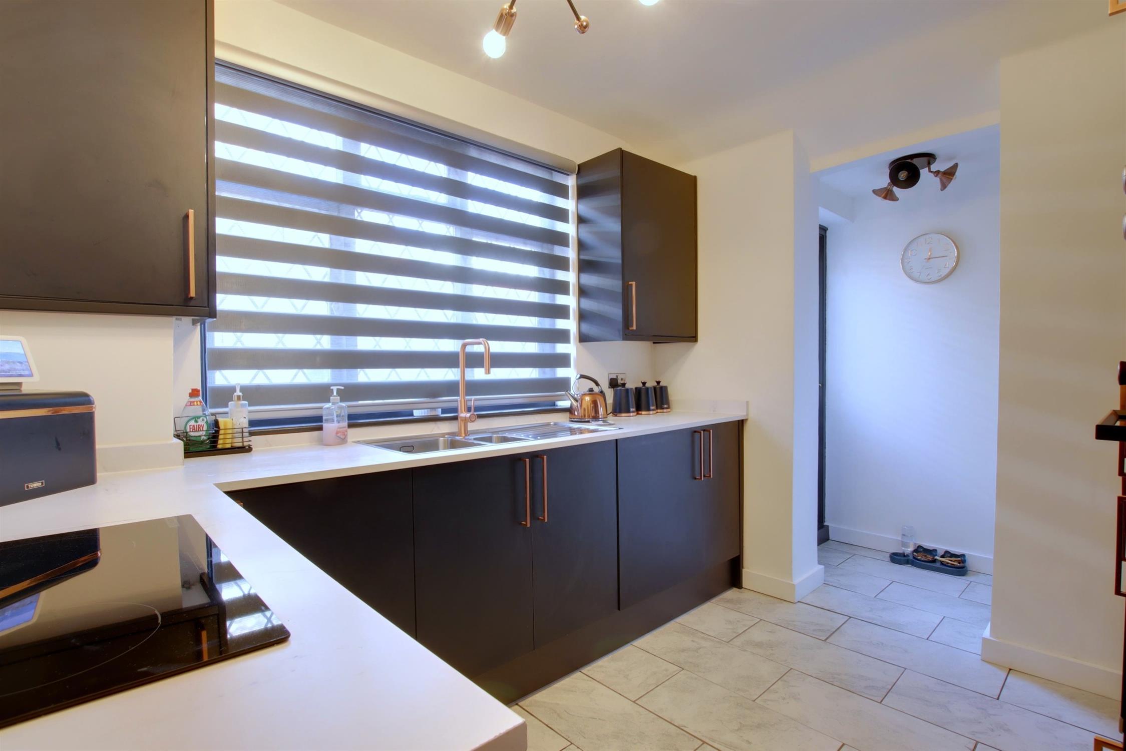 Double glazed window to the side aspect. Smooth ceiling. Matching wall and base units with contrasting work tops. Inset 'Franke' sink and half drainer. Four ring induction 'Bosch' hob with a glass splashback. Integrated appliances include fridge/freezer, oven, microwave and washing machine. Wall-mounted 'ideal' combination boiler within wall unit. Tiled flooring. Double glazed door leading to the side aspect. Tall column style radiator.