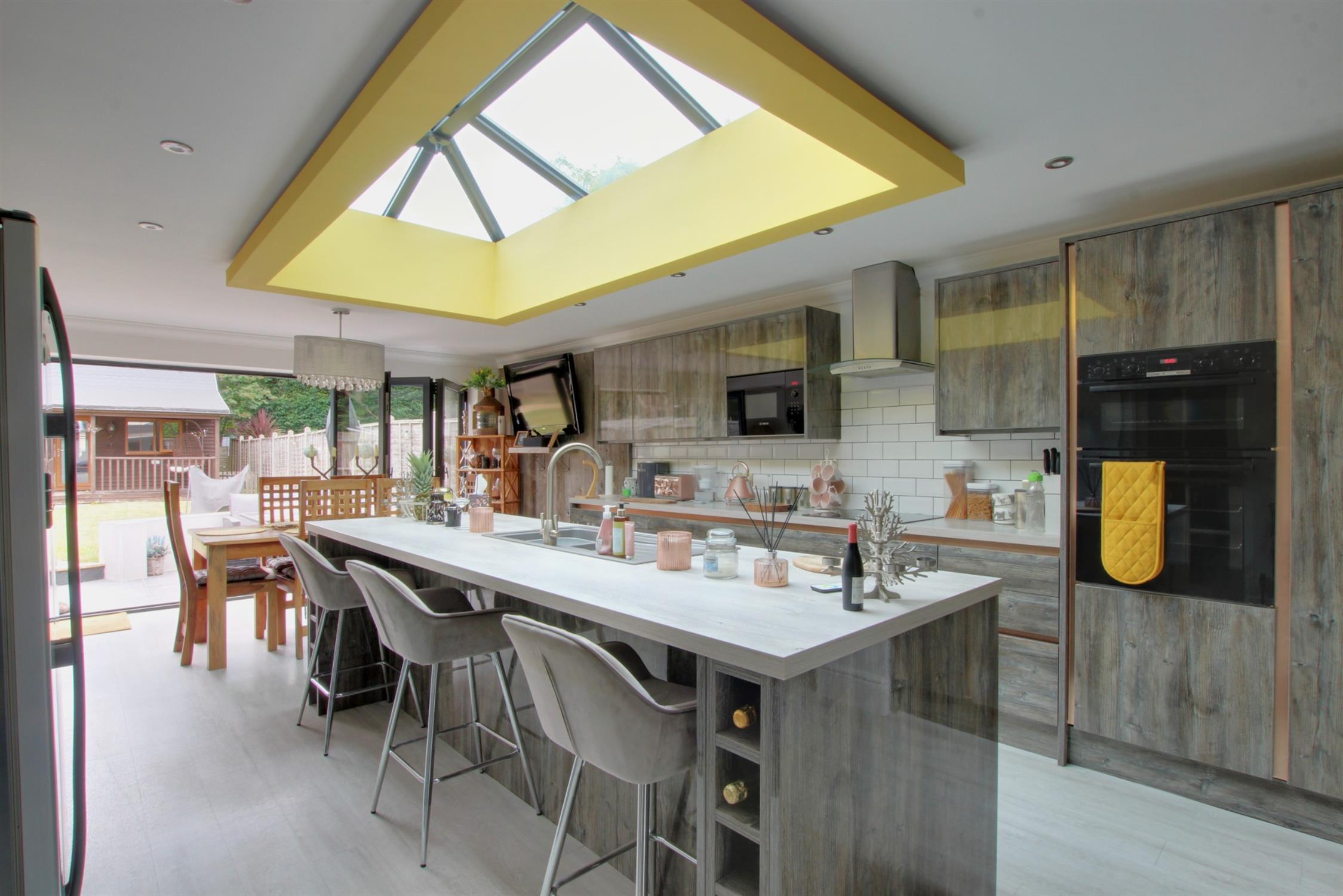 Three ceramic radiators, lantern light, double Bi-fold doors, a range of wall and base units with a hard top work surface incorporating one and a half sink with mixer tap over, ceramic hob with extractor hood over, built in double eye level oven, space for a fridge/freezer, integral dishwasher and Bosch microwave, central unit with seating for four and built in cupboard, the dining room has a double glazed leaded window, two cupboards, radiator.