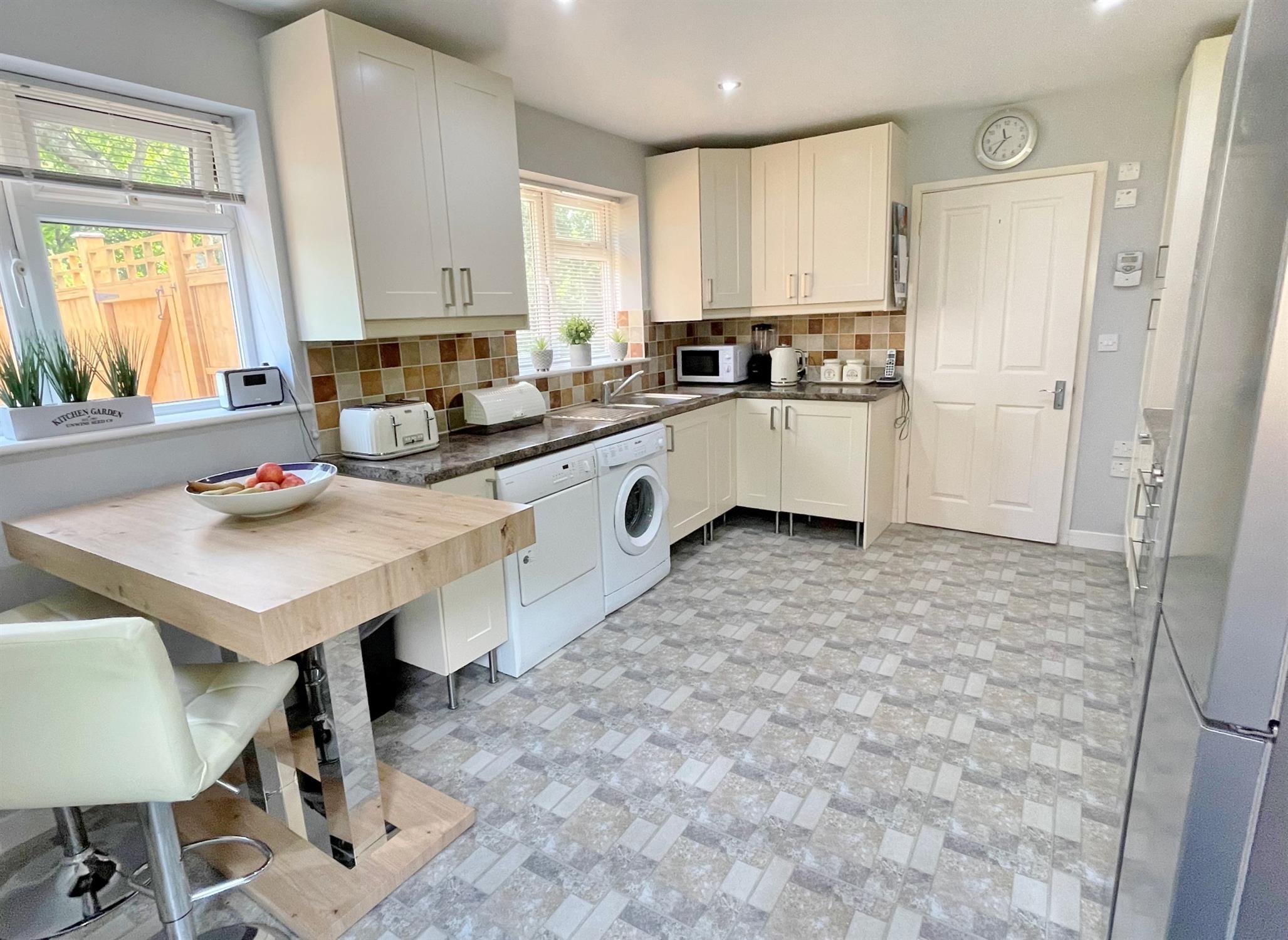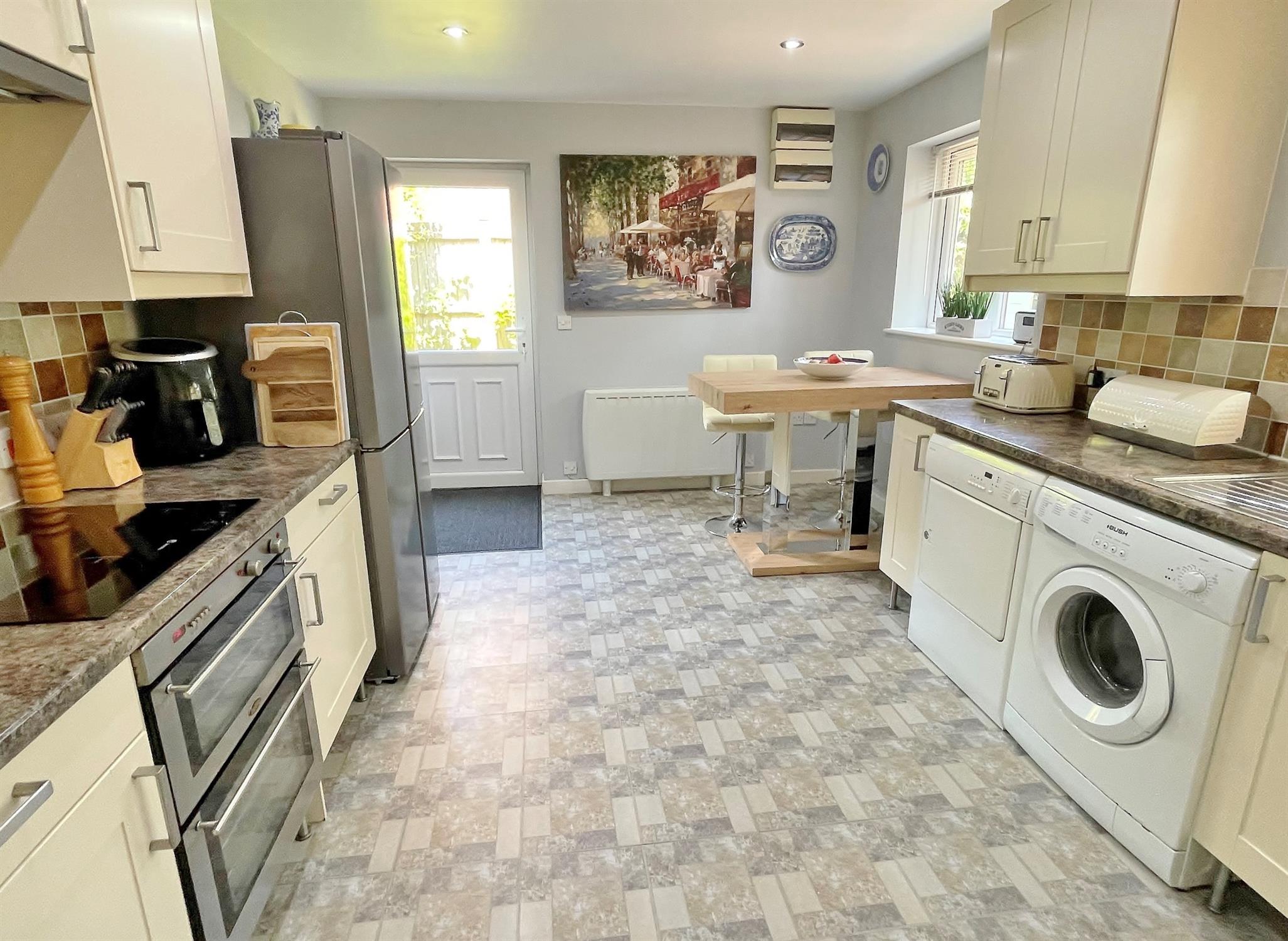 One and a half bowl stainless steel sink unit. Tiled splashbacks. Four ring induction hob with extractor over. Built in electric double oven. Space and plumbing for American fridge freezer. Electric radiator. Door to side.