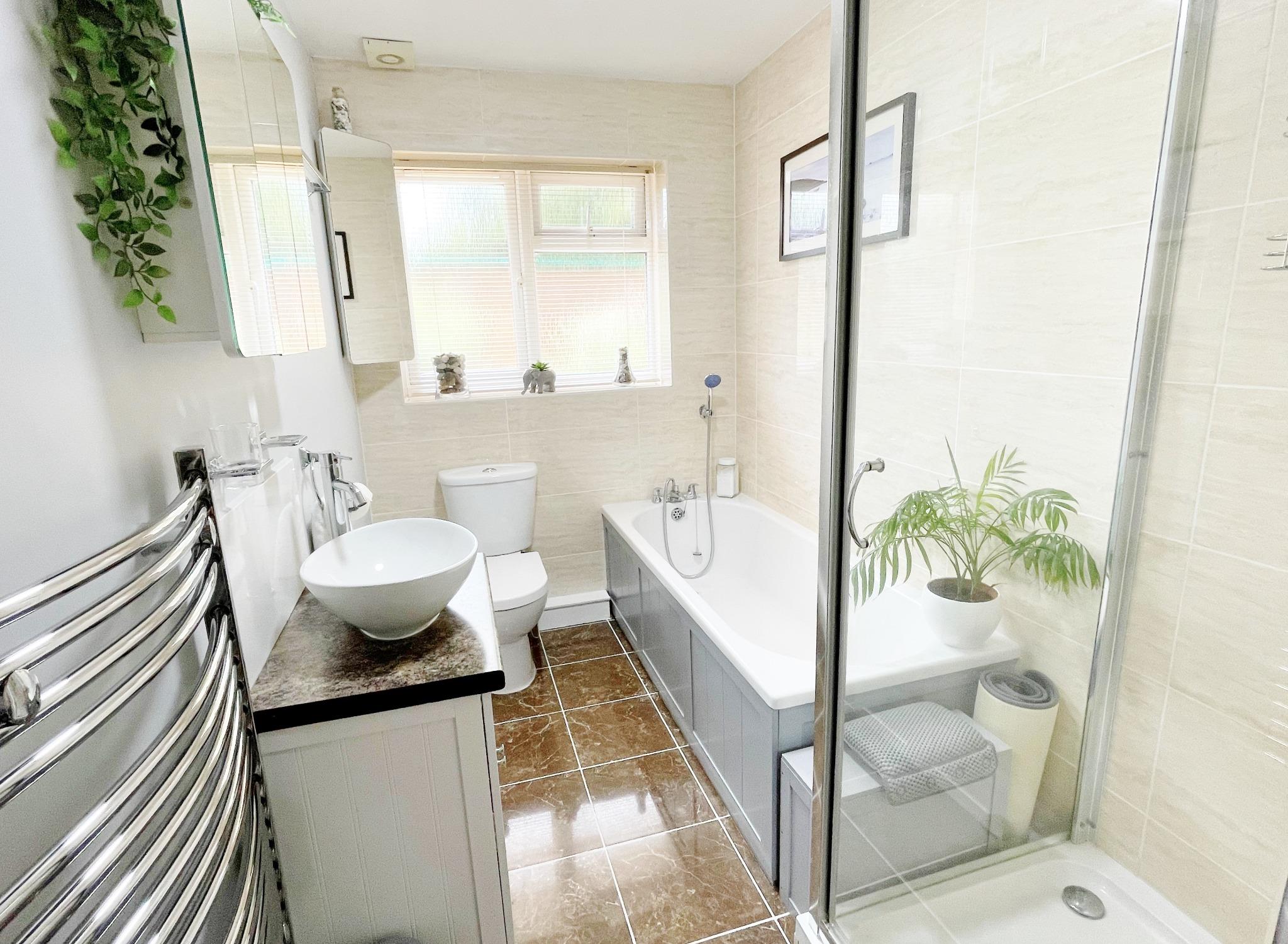 Window to rear. Low level WC. Inset wash hand basin with cupboard below. Panelled bath with mixer tap. Glazed shower unit. Complementary tiling. Electric heated towel rail. Tiled flooring.