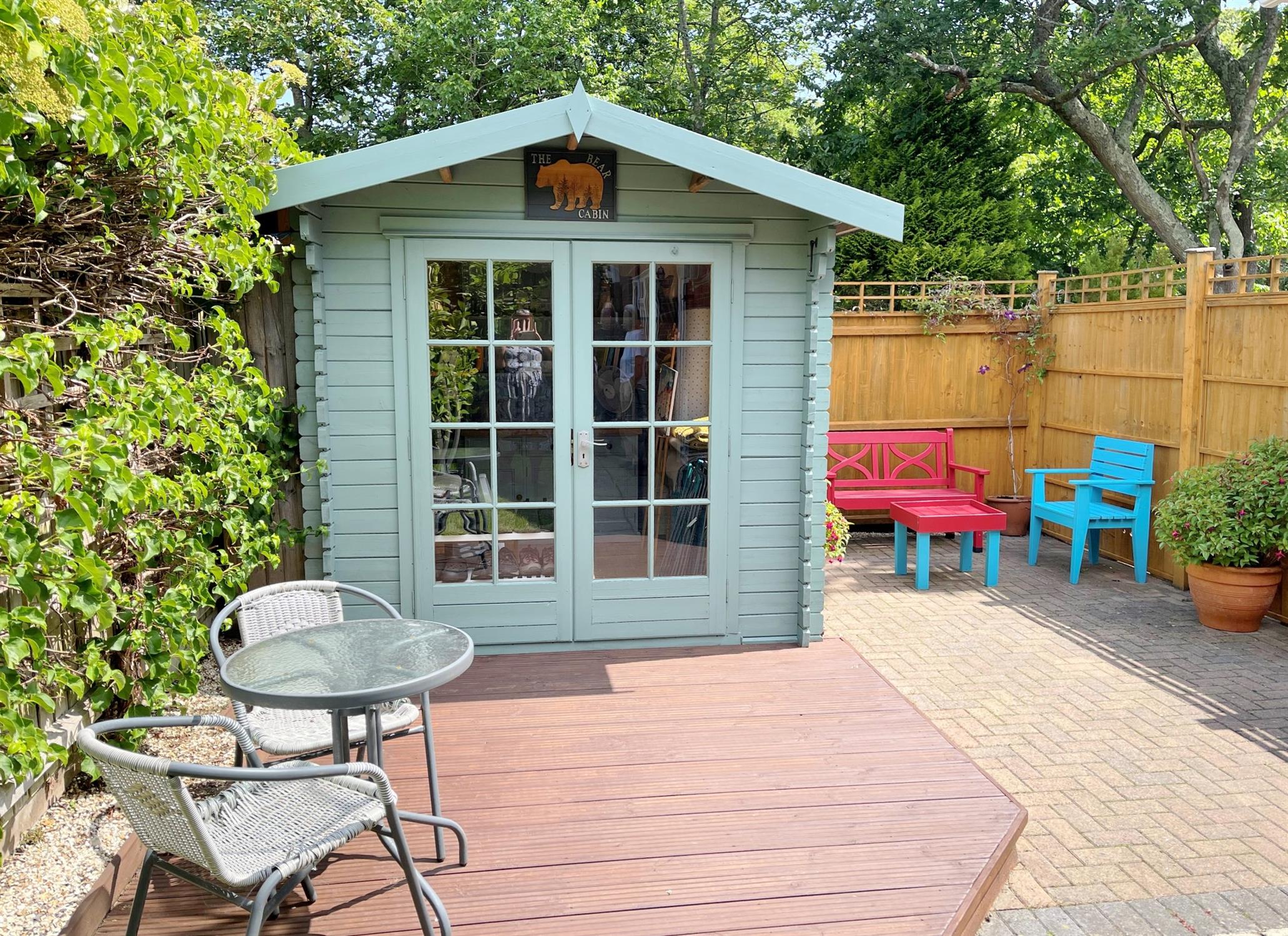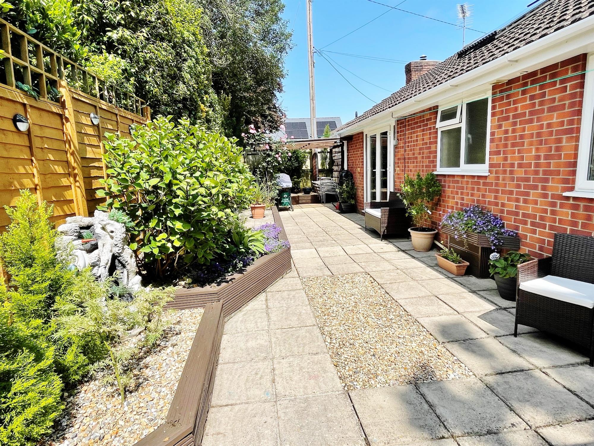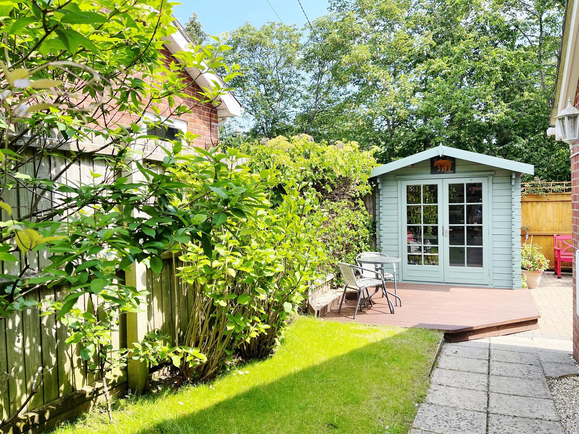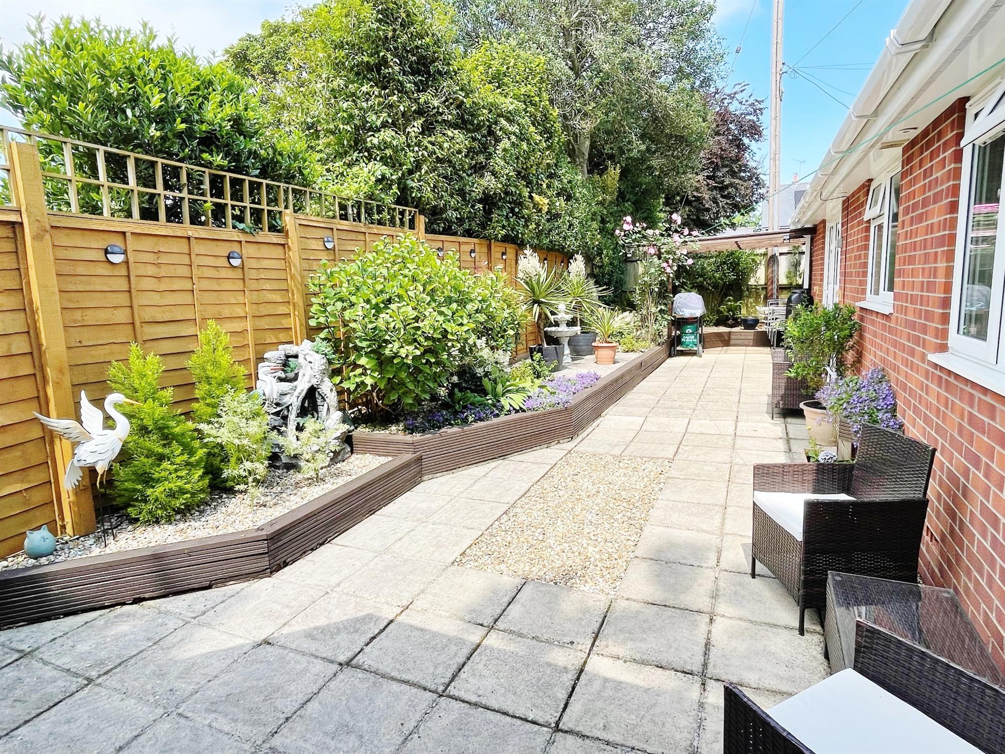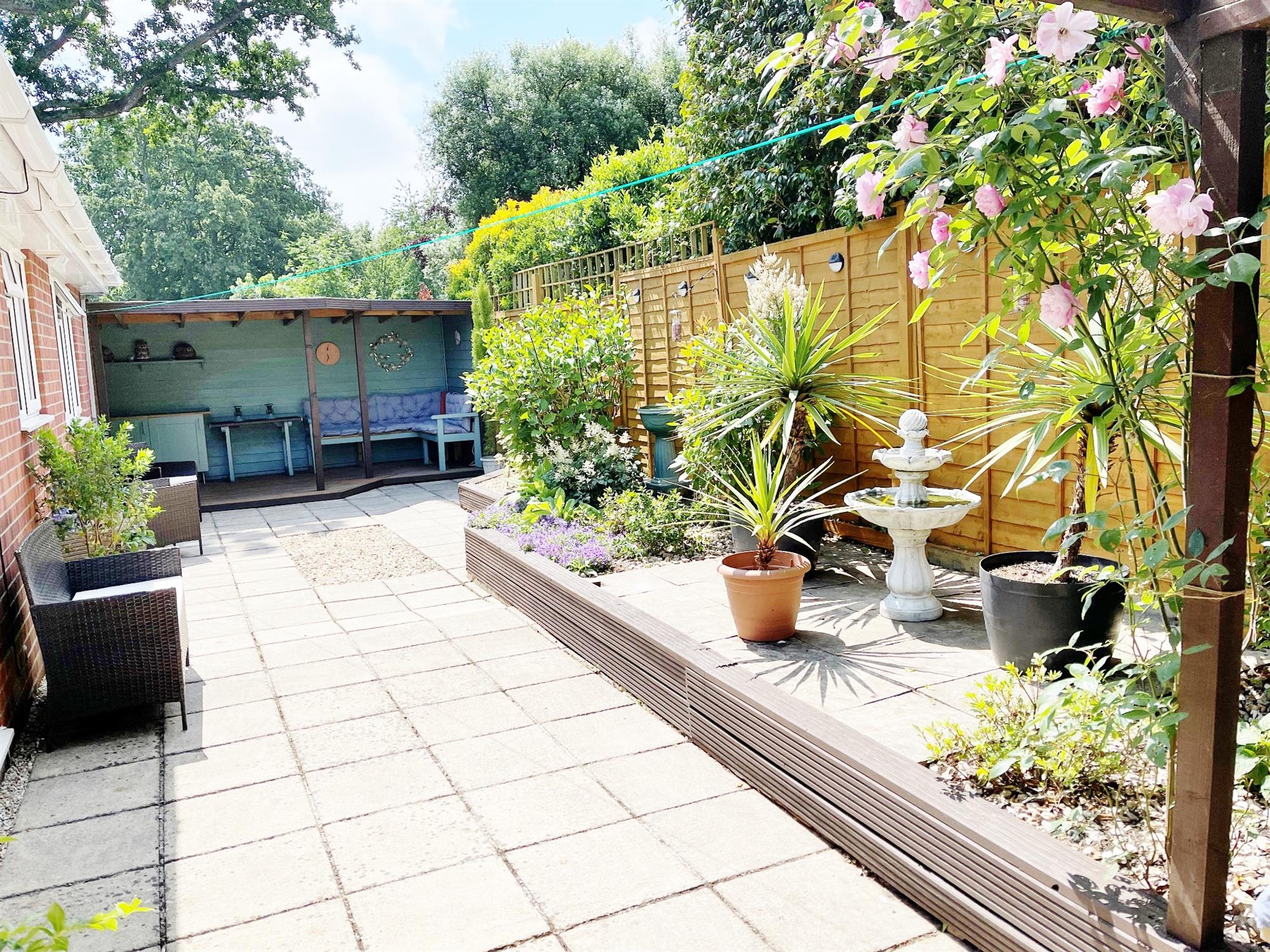 Wrap around garden. Laid to paving for easy maintenance. Raised planters with mature shrubs and bushes. Undercover seating area. Summerhouse. Decked seating area. Rear door to workshop.
