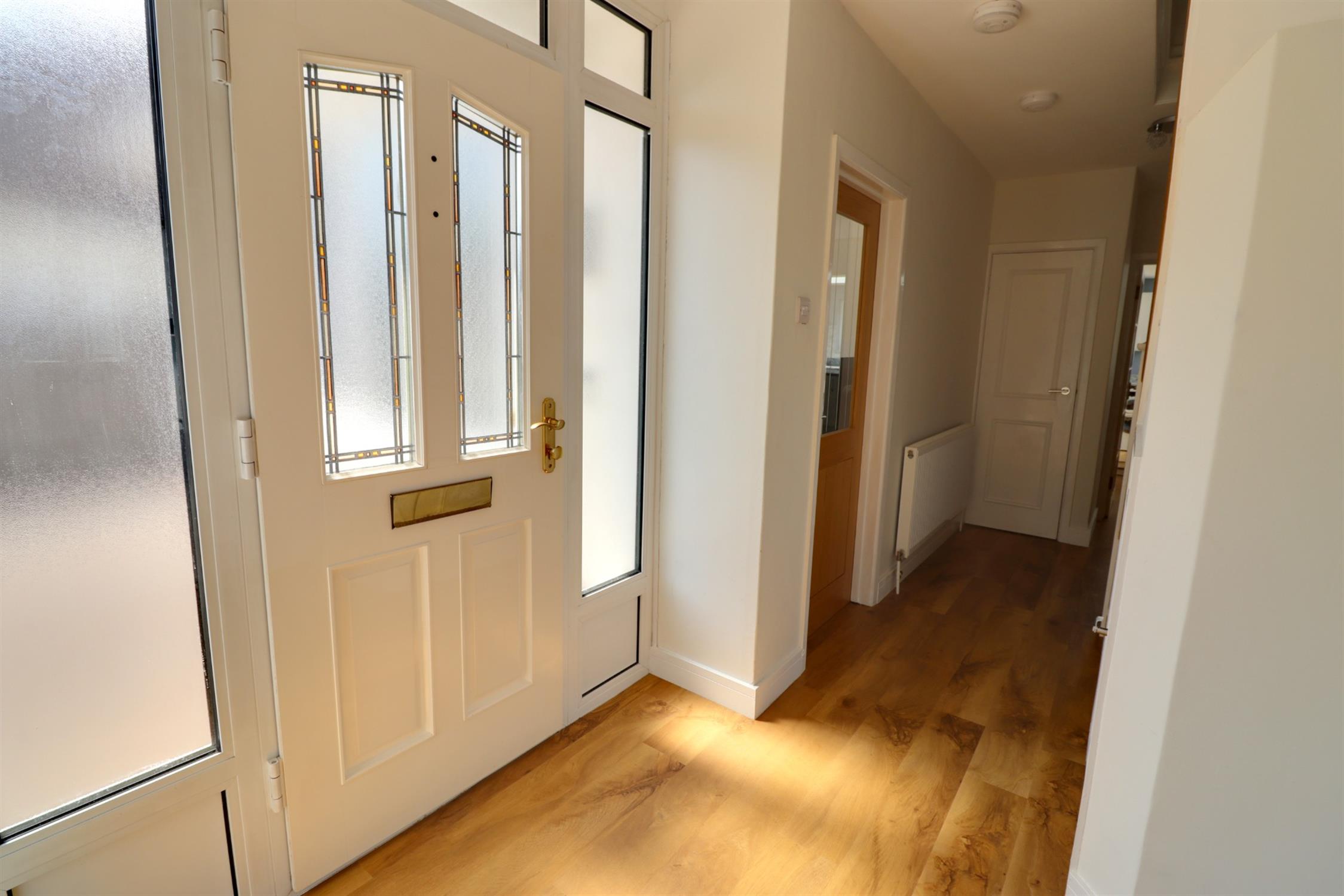 Opaque double side windows, lead light opaque double glazed front door, Karndean flooring, stairs to first floor landing, understairs storage, radiator, slatted shelved storage cupboard.