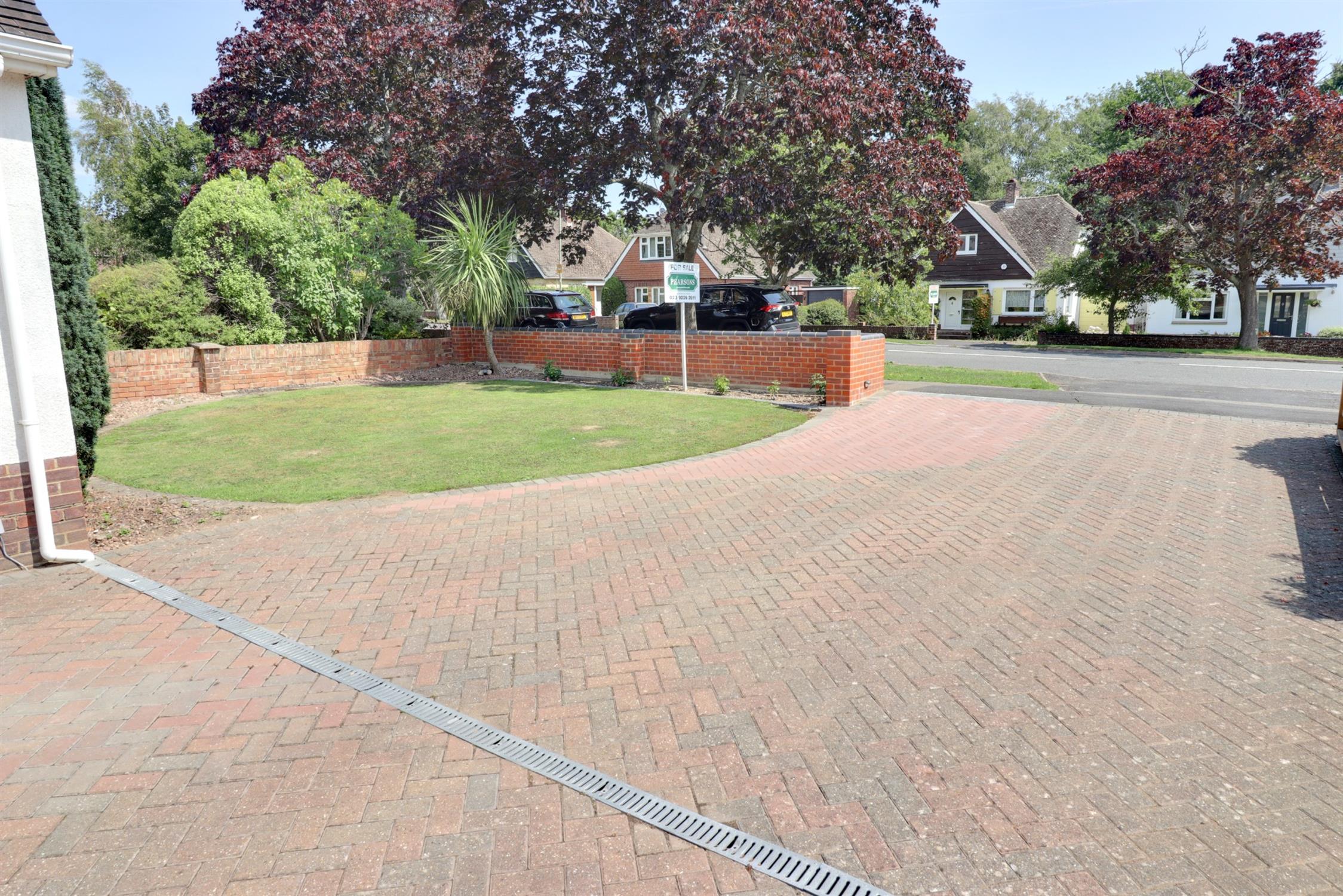 Brick built boundary wall, predominantly laid to lawn with extended block brick driveway offering parking for numerous vehicles.