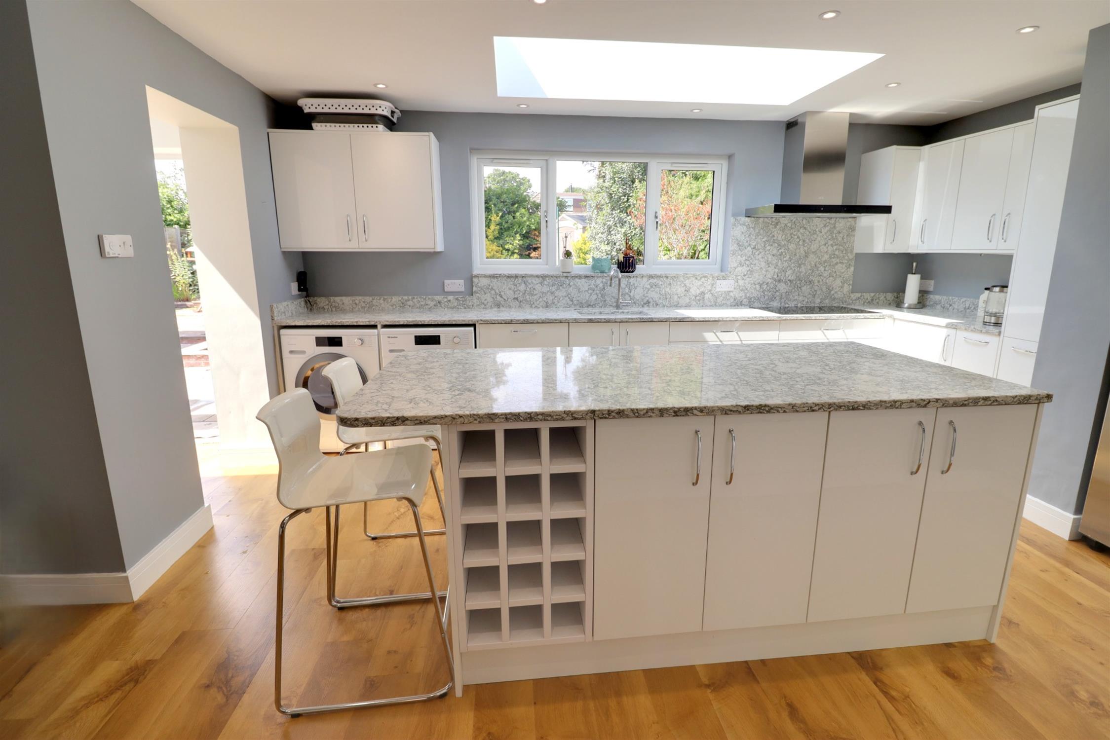 Double glazed window to rear, modern fitted range of wall and base units with quartz worktops, under mounted one and a half bowl sink with mixer tap, worktop drainer grooves, plumbing and space for washing machine and tumble dryer, built in dishwasher, AEG induction and overhead extractor hood, space and plumbing for American style fridge/freezer, two AEG fan assisted electric ovens, concealed Worcester gas boiler, water softener, central kitchen island with base storage units and quartz worktops, radiator.