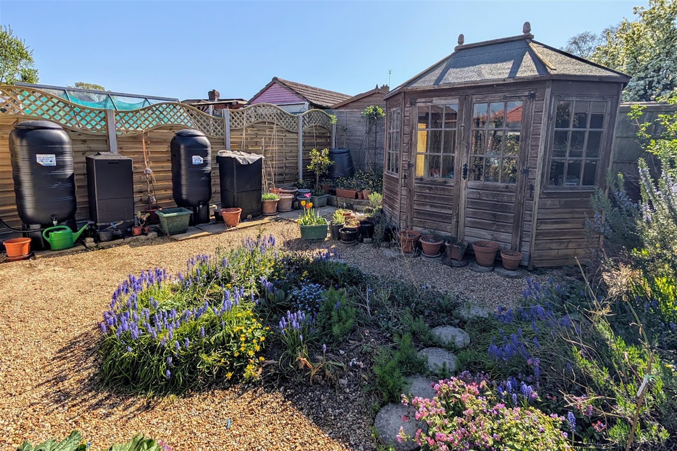 The rear garden has a patio area adjacent to the property. The remainder of the garden has an array of well-stocked flower and shrub borders with gravel pathways connecting them. There is a timber octagonal summerhouse. The garden is fence enclosed, with new fencing to the left hand side, has an outside water tap, gated side pedestrian access and double glazed personal door to garage.