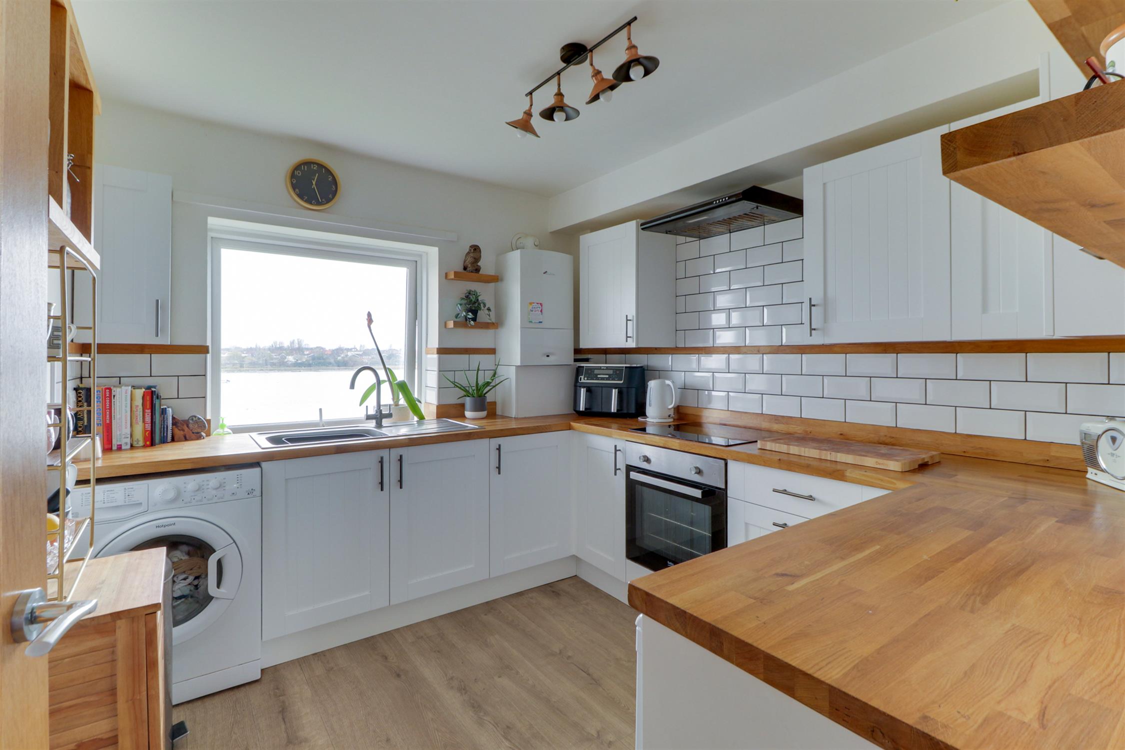 Smooth ceiling, UPVC double-glazed window, wall-mounted boiler, a range of wall and base-mounted units with roll-top work surfaces over, inset sink and drainer, tiled splash back, induction hob, oven, space and plumbing for appliances and laminate flooring.