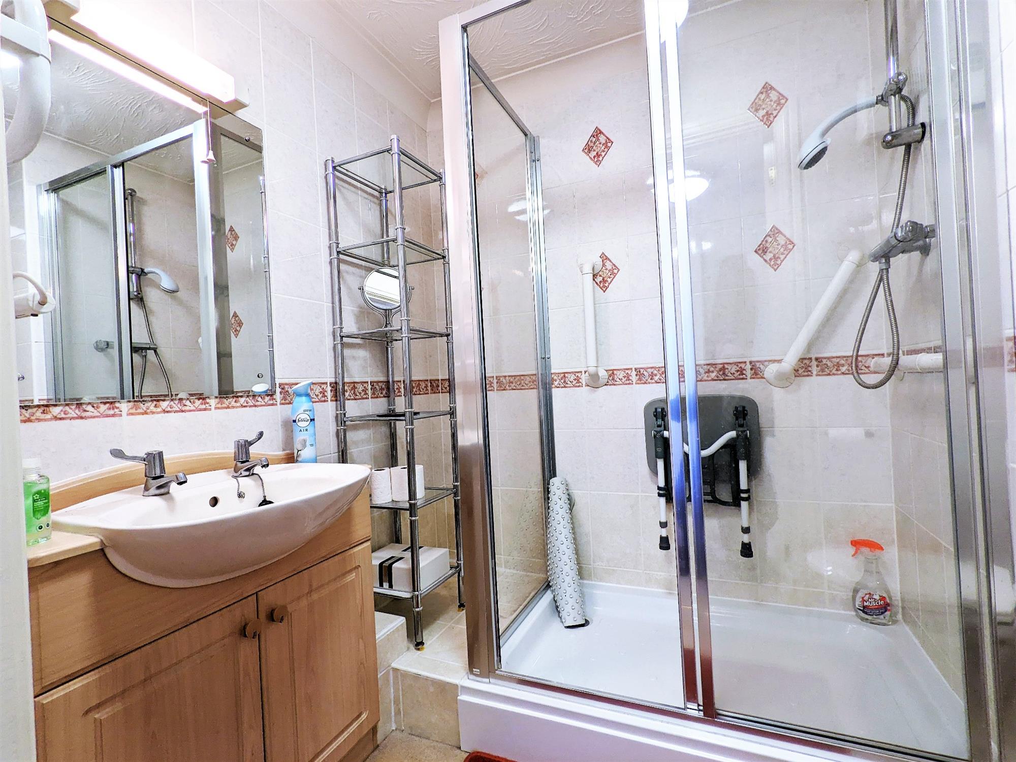Comprising shower enclosure with emergency button located on the shower base tray, low level WC and vanity unit with inset wash hand basin, mirror, & light over. Extractor fan. Heated towel rail, and wall mounted heater.