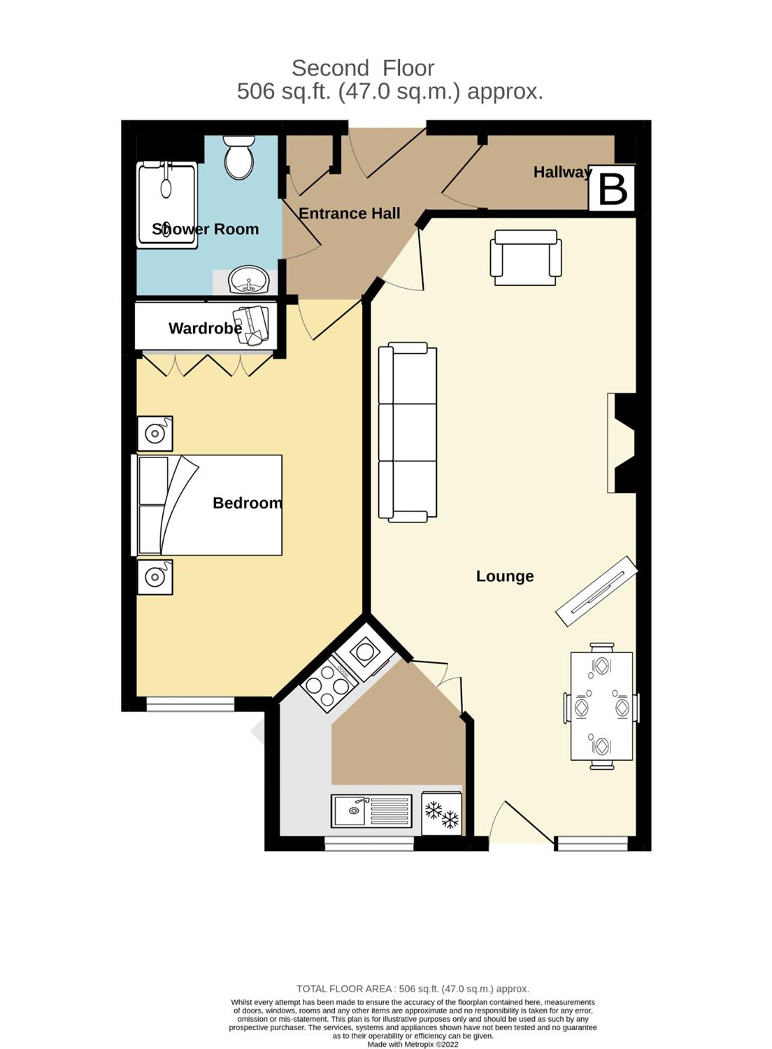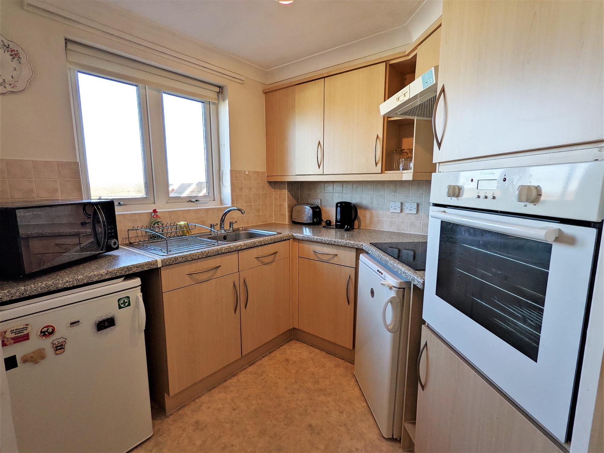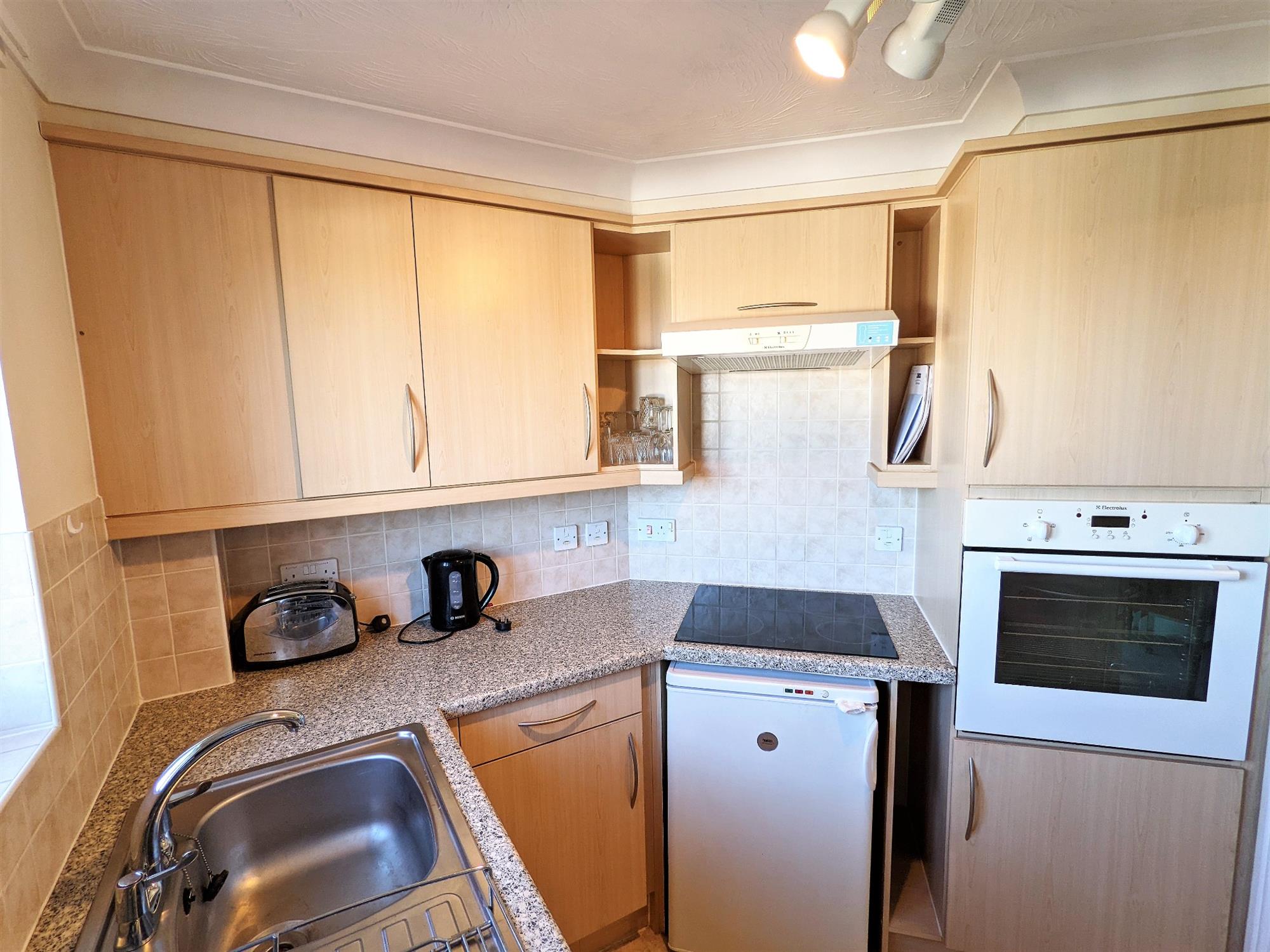 Double-glazed window to the front aspect, fitted with a range of beech wood effect wall and base units and drawers with roll edge work surfaces over and inset single drainer stainless steel sink unit. Built-in electric hob with extractor hood and light above and separate eye level electric fan oven. Fitted under worktop fridge & freezer. Ceiling light. Wall mounted fan heater. Power points. Emergency pull cord.