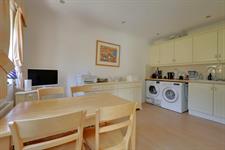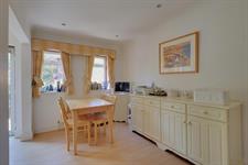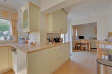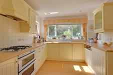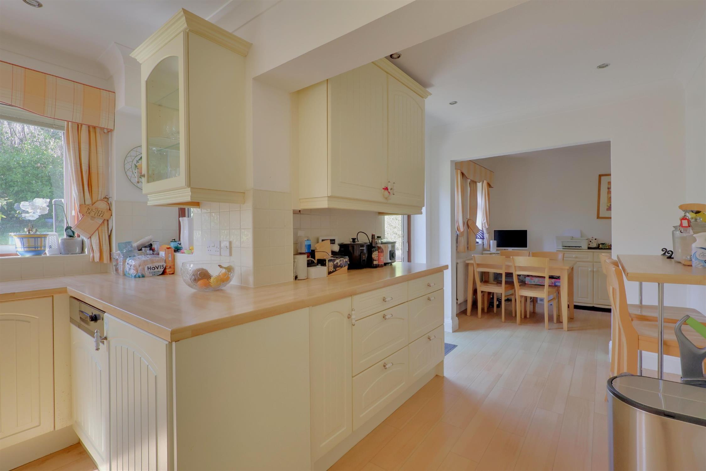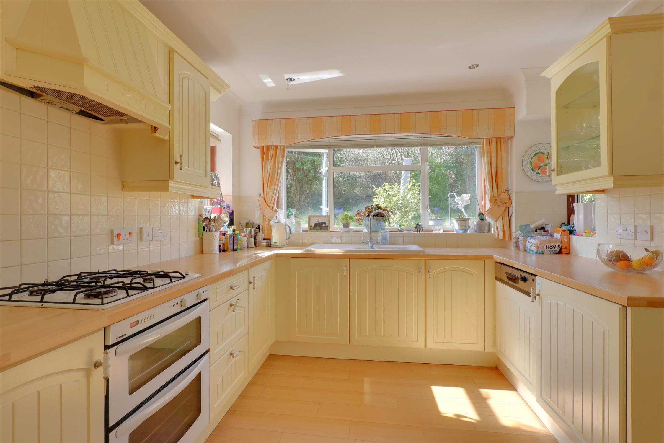 A range of wall and base cupboards with work surface over. Inset one and a half ceramic sink unit with drainer. Integrated double oven, dishwasher, fridge and freezer. Four ring gas hob with extractor fan. Radiator. Three double glazed windows. Door to the rear garden.