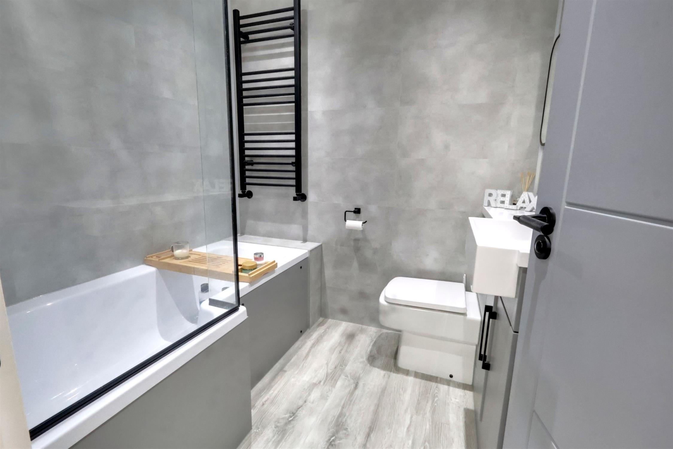 Luxury suite comprising panel bath with glazed screen. Drench shower head and hand held shower attachment. Close couple WC. Wash basin in surround with vanity mirror over. Ladder style radiator.