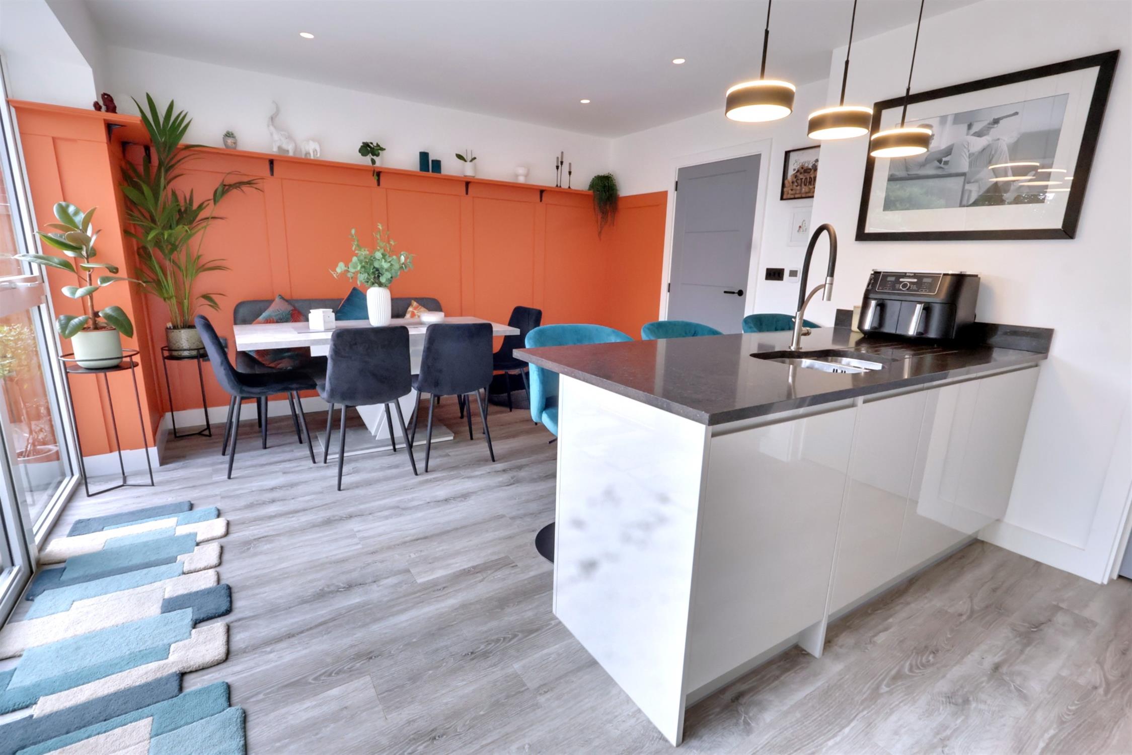 Excellent range of floor and wall units to kitchen area beneath quartz granite work surfaces. Five ring induction hob with extractor fan over. Eye level double oven. Integrated fridge / freezer. Dishwasher. Peninsular breakfast / serving area, inset circular sink with mixer tap over. Part panel walls to family area. Double glazed window and bi fold doors open to the rear garden.