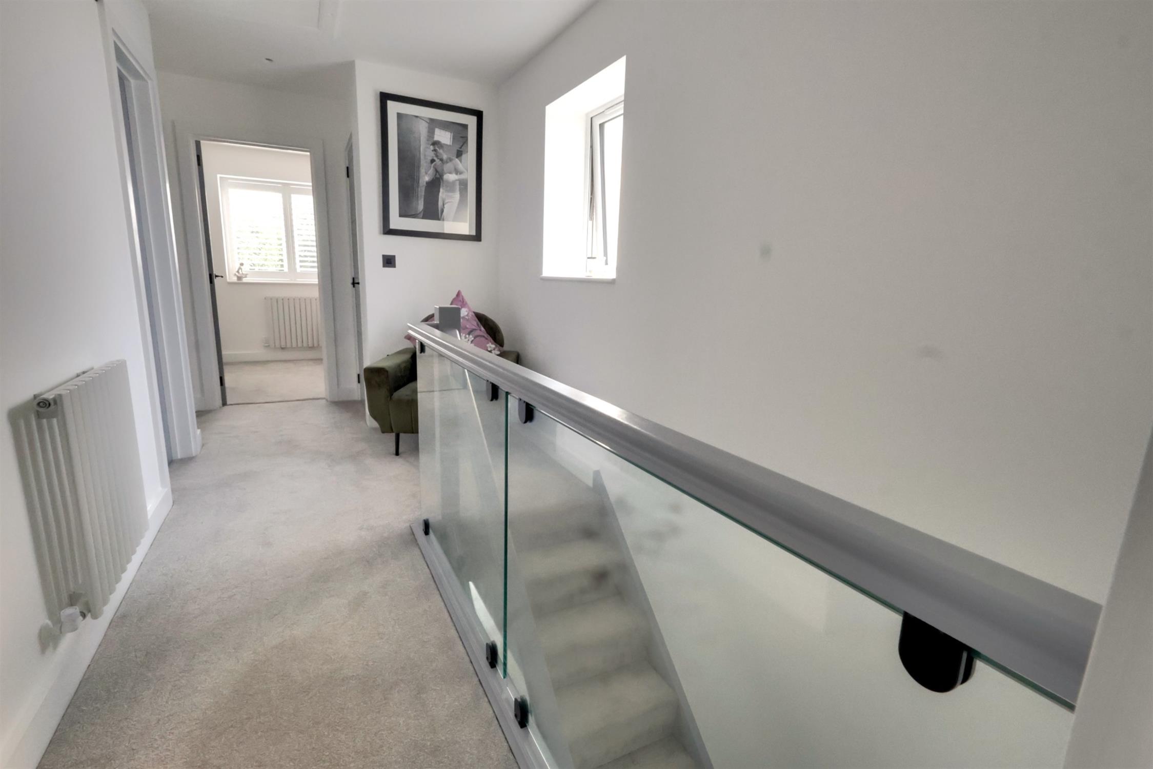 Composite security door. Laminate flooring. Stairs to landing with cupboard below.