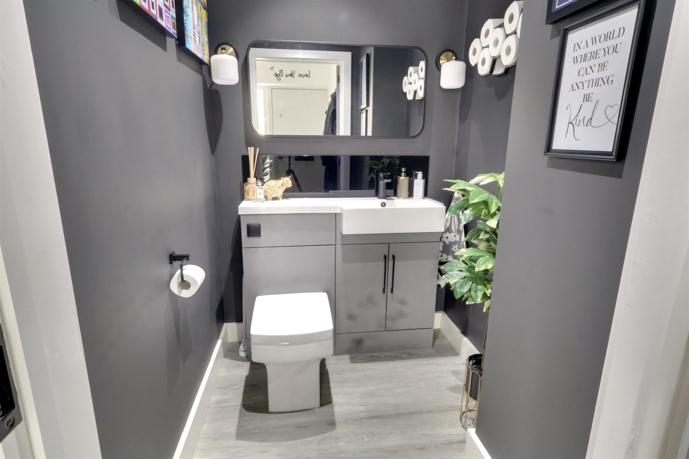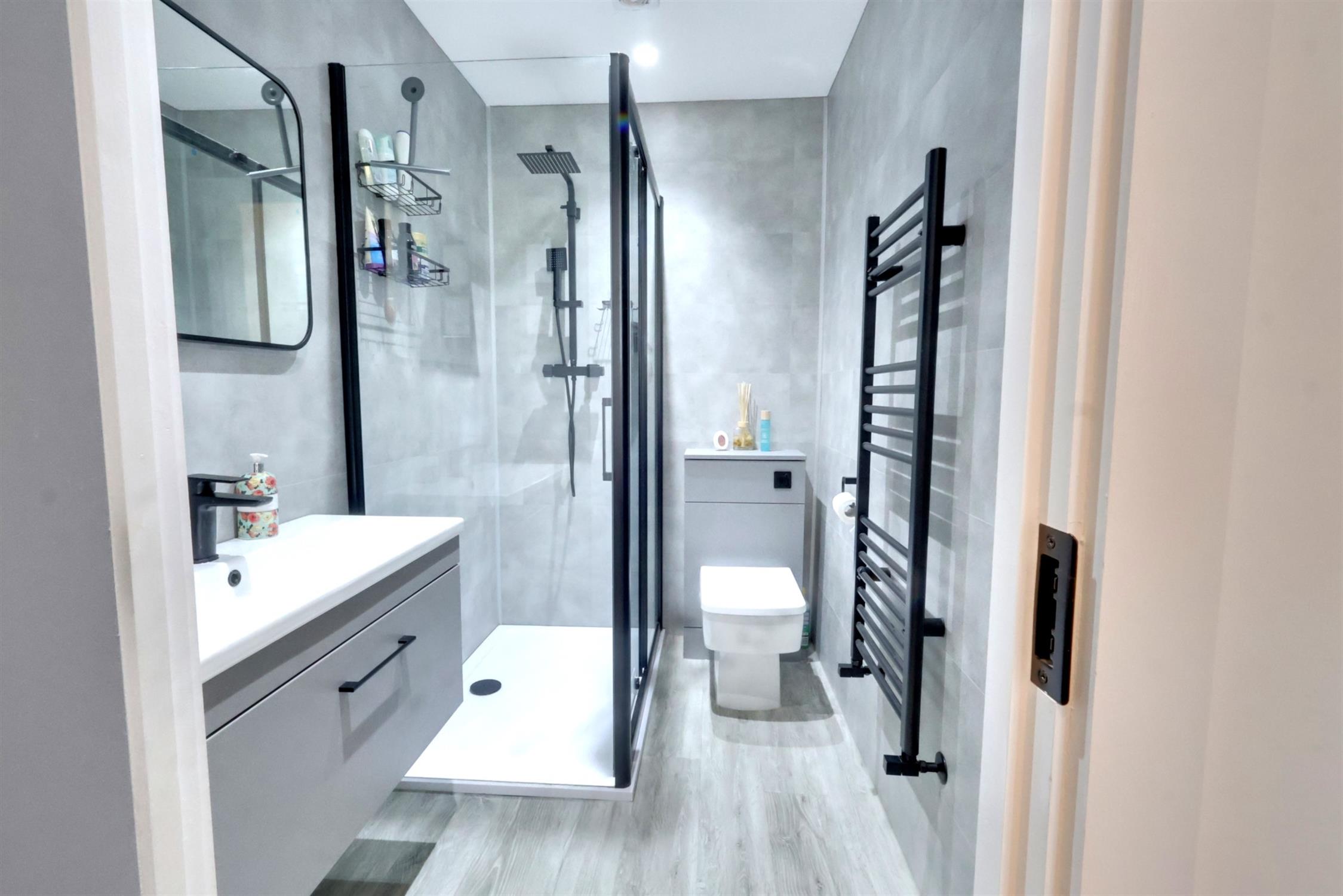 Walk in shower cubicle. Wash basin in surround with vanity mirror over. Close couple WC. Ladder radiator.