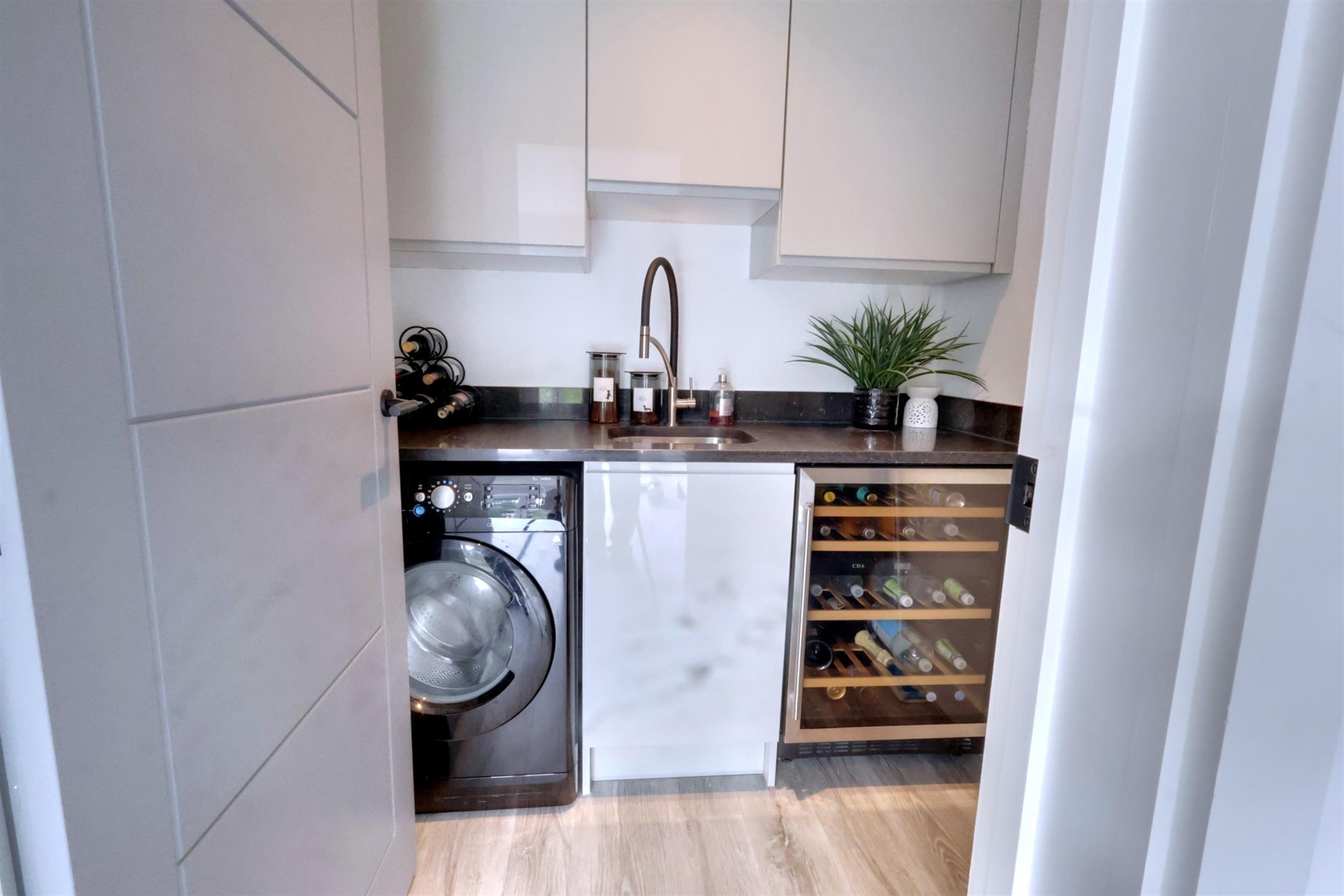 Matching base and wall cupboard unit and quartz granite work surface. Inset sink unit. Plumbing for automatic washing machine.
