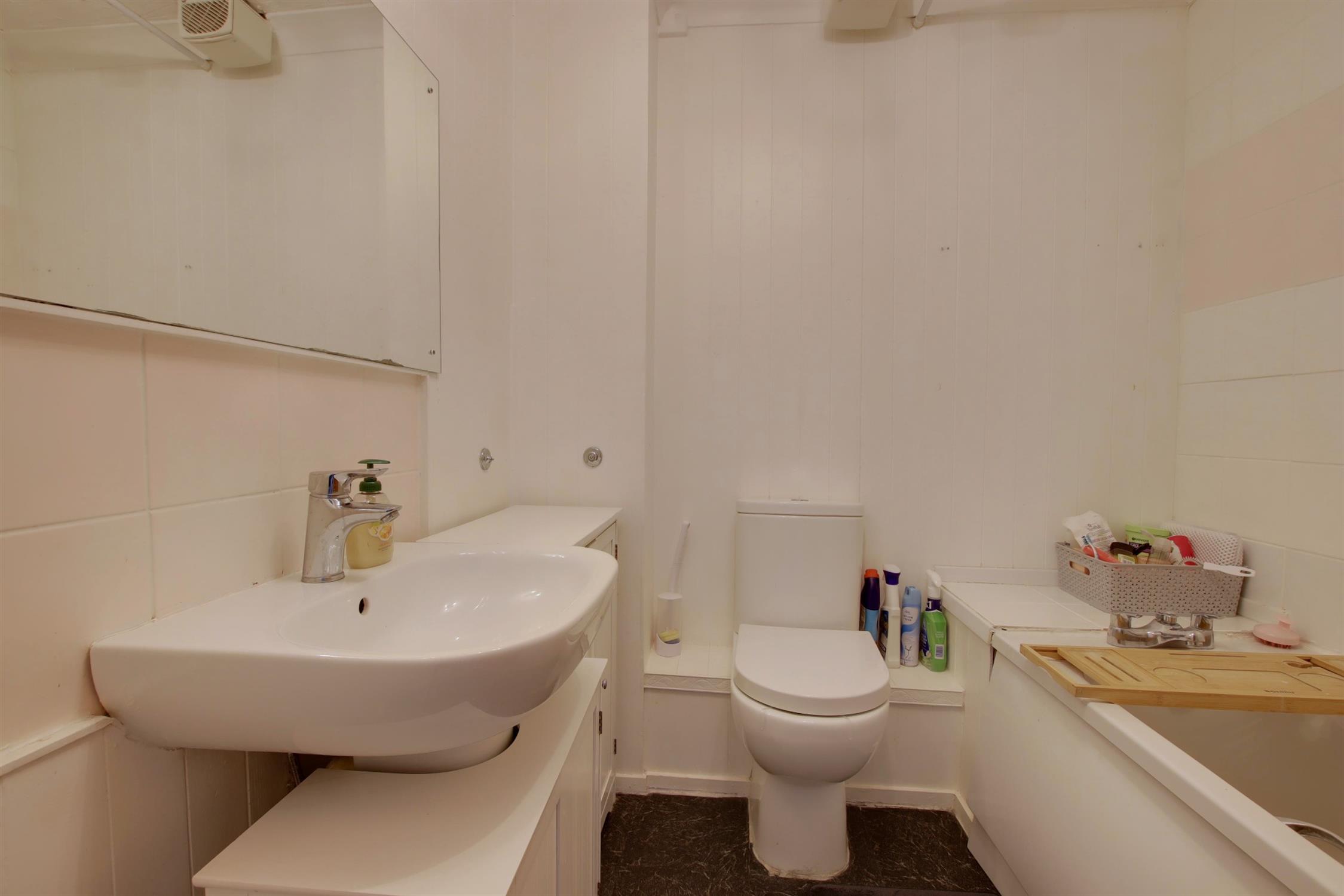 Suite comprising; panelled bath with shower over and rail. Low level WC, wash hand basin, part tiled and panelled walls. Tiled effect vinyl flooring. Extractor fan.