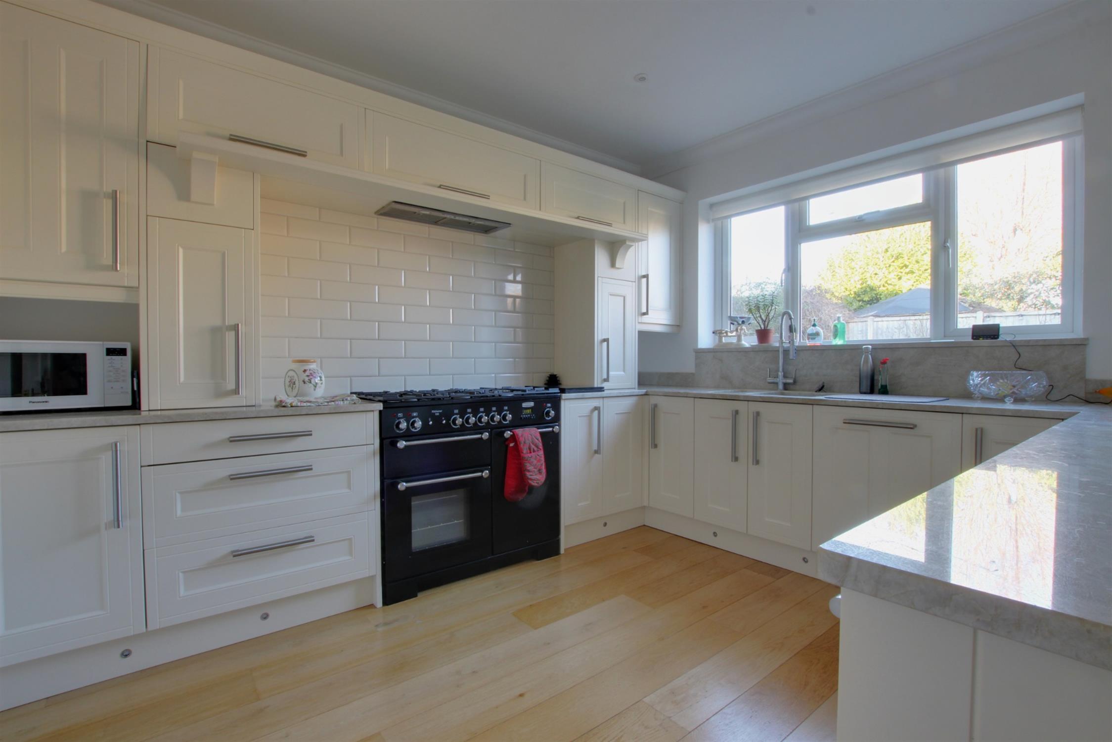 A range of wall and base cupboards with work surface over. Inset one and a half ceramic sink with drainer. Range style oven with extractor fan over. Integrated fridge and dishwasher. Radiator. Wooden flooring. Double glazed window.