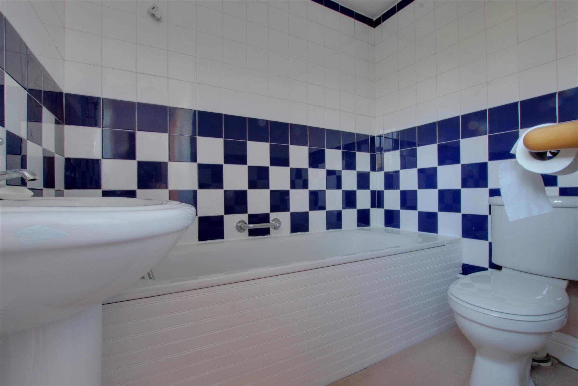 Panelled bath with mixer tap. WC. Ceramic sink. Heated towel rail. Frosted double glazed window.
