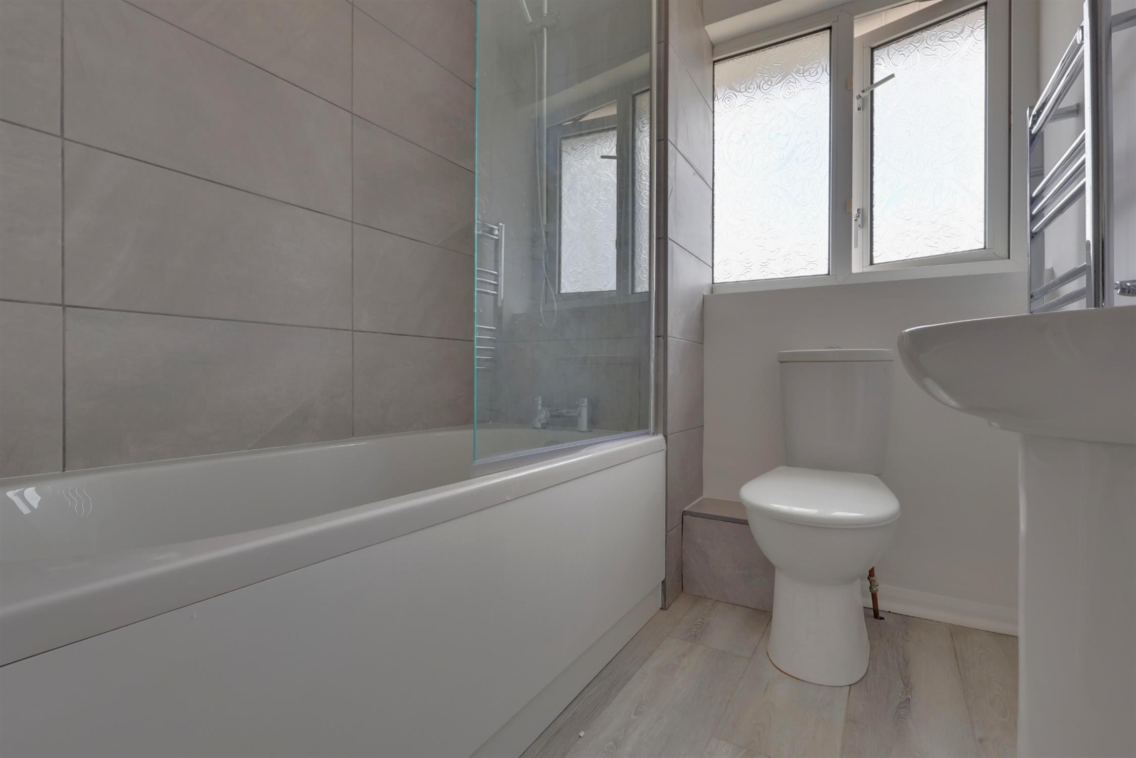 Consists of a modern three-piece white suite and shower over the bath. Low level W.C. Pedestal wash hand basin. Part tiled walls. Radiator.