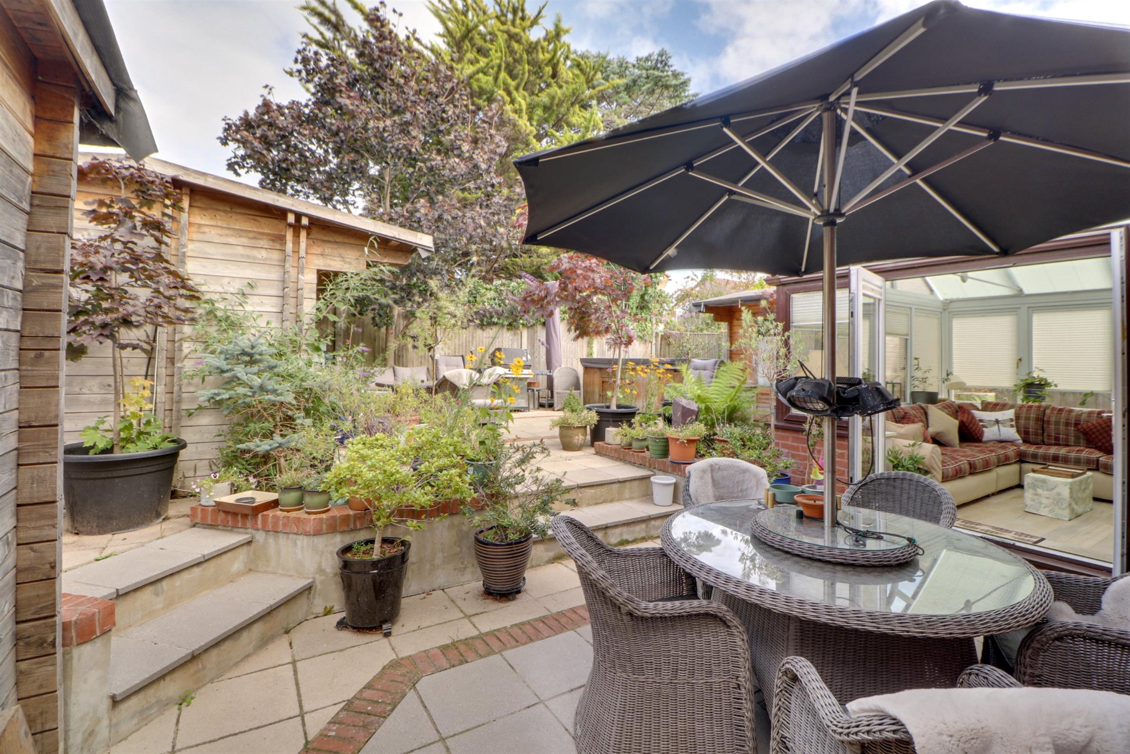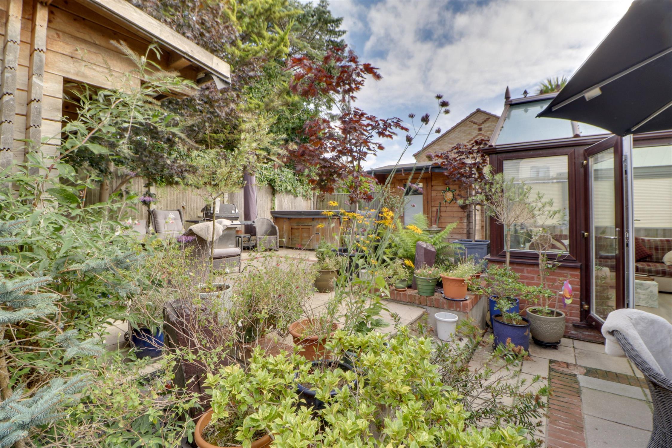 Front - Sweeping frontage of block paved driveway providing off road parking and leading to garage. Border with mature trees and shrubs. Rear - A multi-level landscaped garden with various patios, water features. Three substantial timber cabins with double glazed windows and doors, power and lighting, making for versatile spaces which could be used for home office, hobbies space, or just excellent storage.