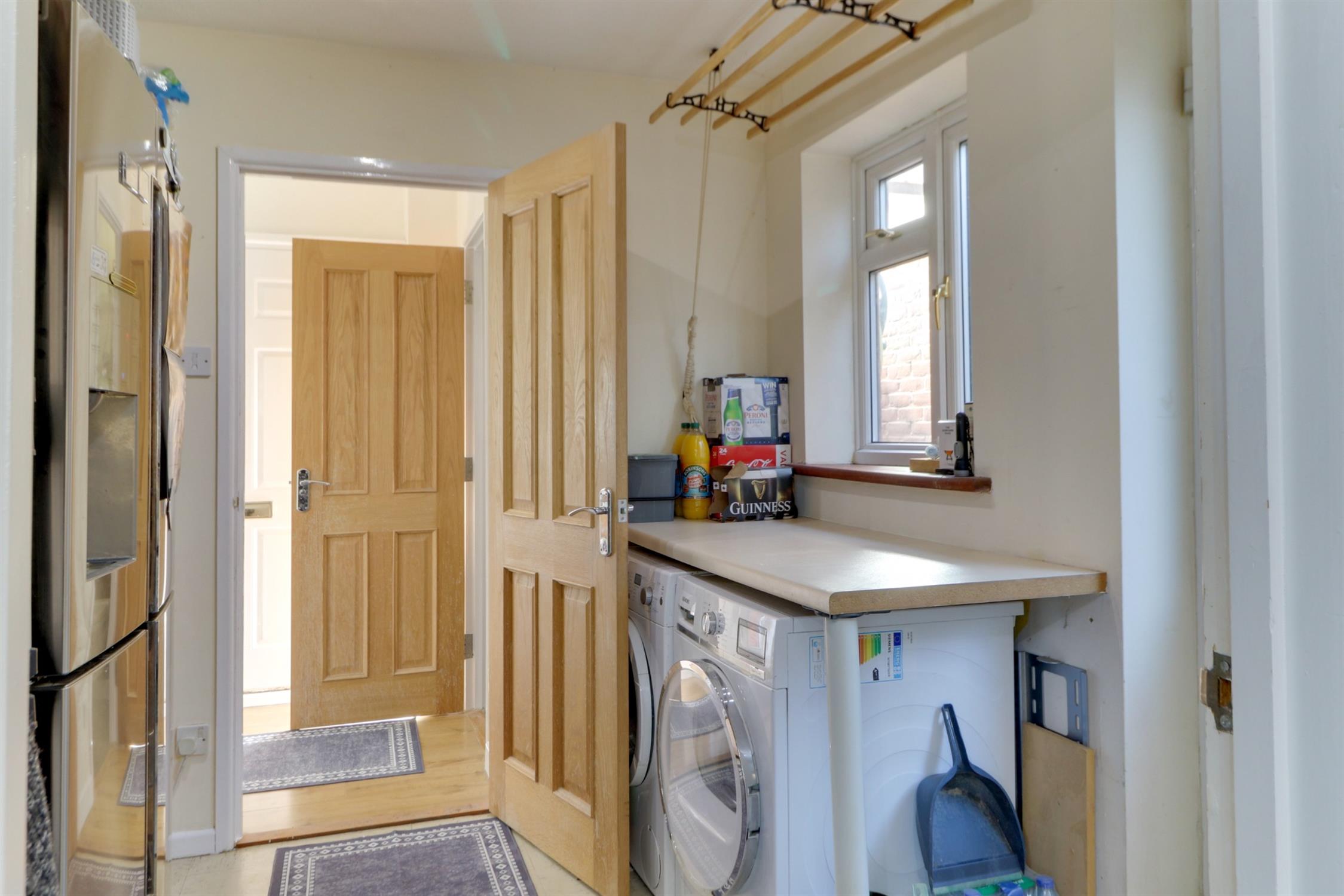 Double glazed side aspect window, double glazed door to side, work surface, space and plumbing for washing machine and tumble dryer, understairs storage cupboard, vinyl tile flooring.