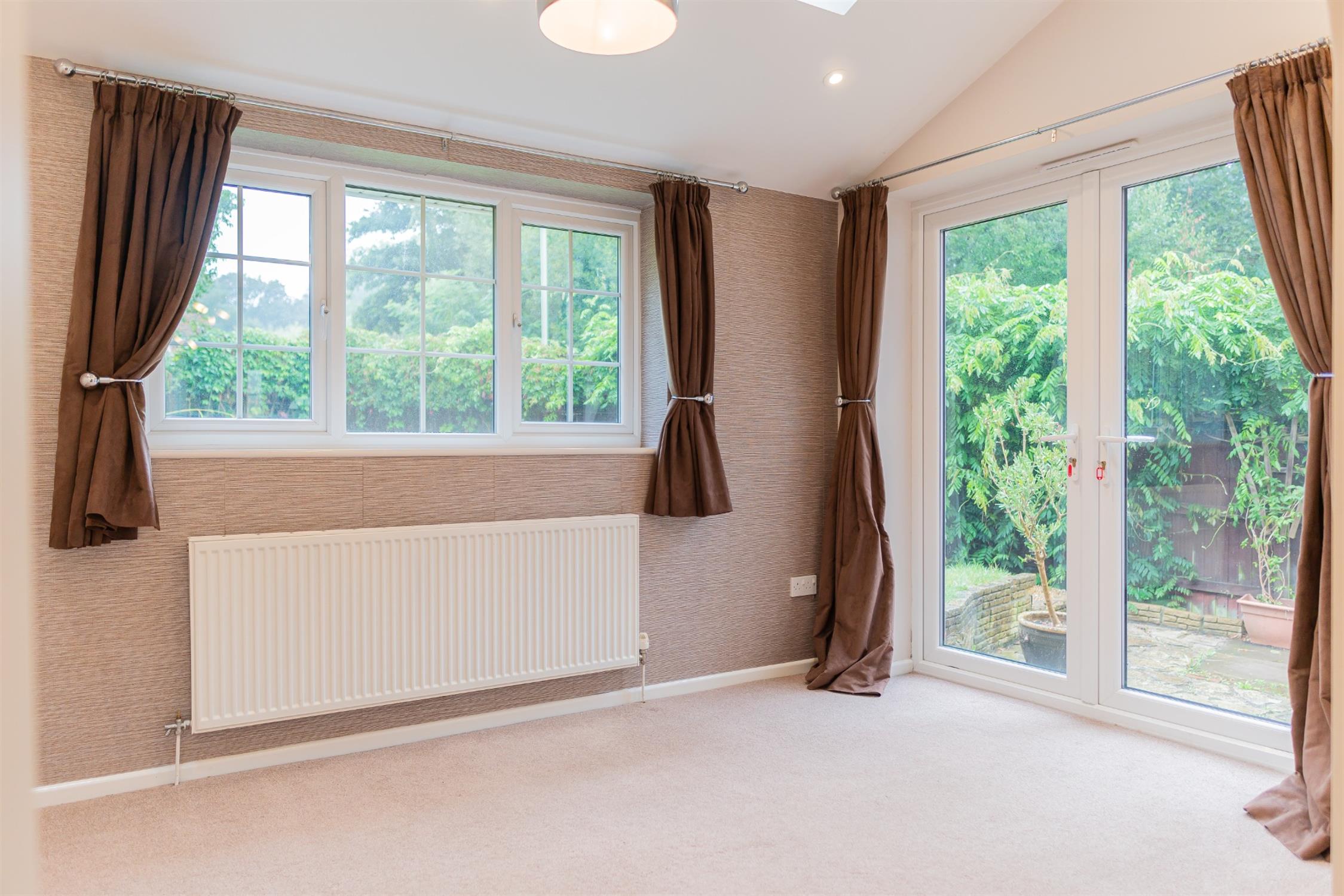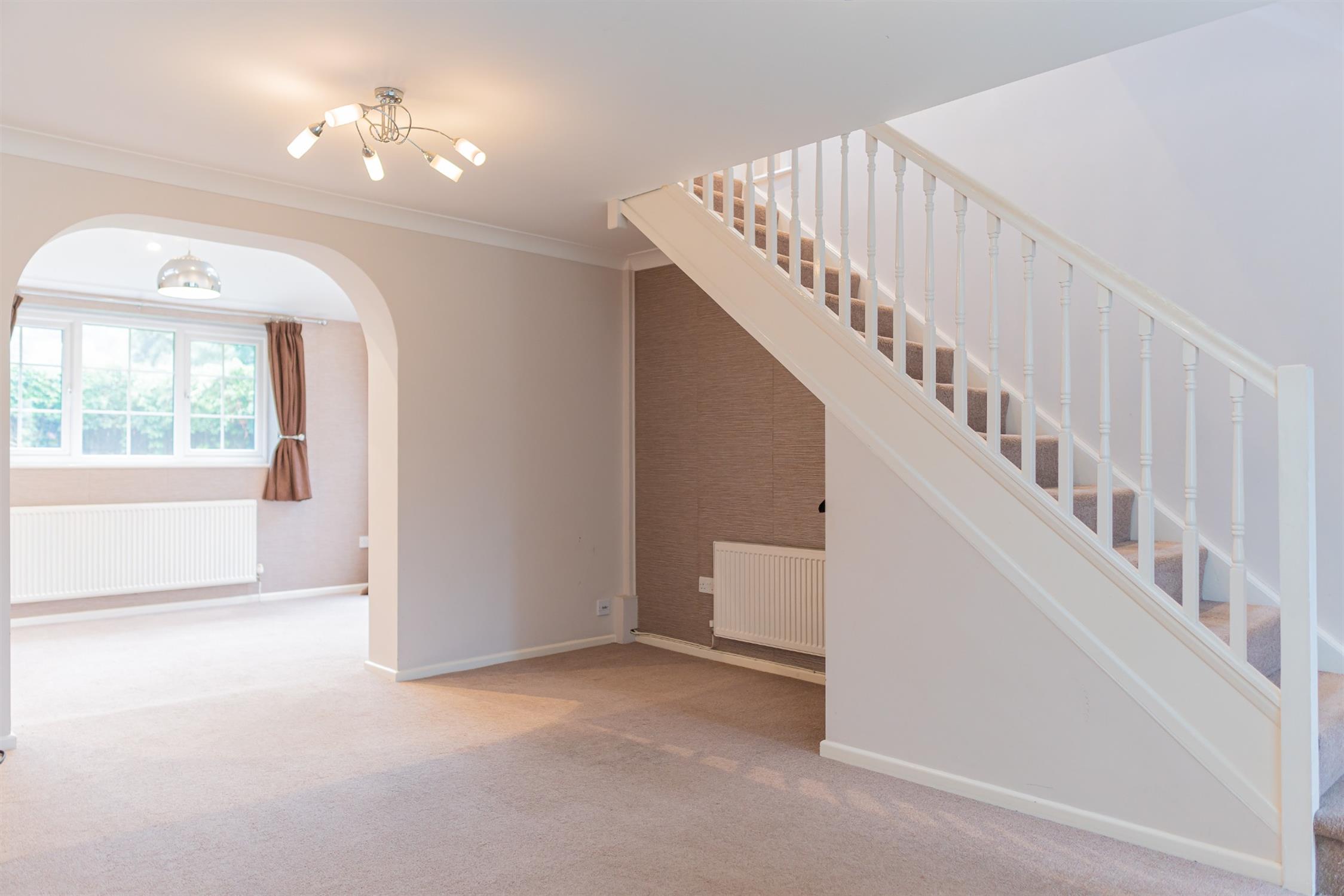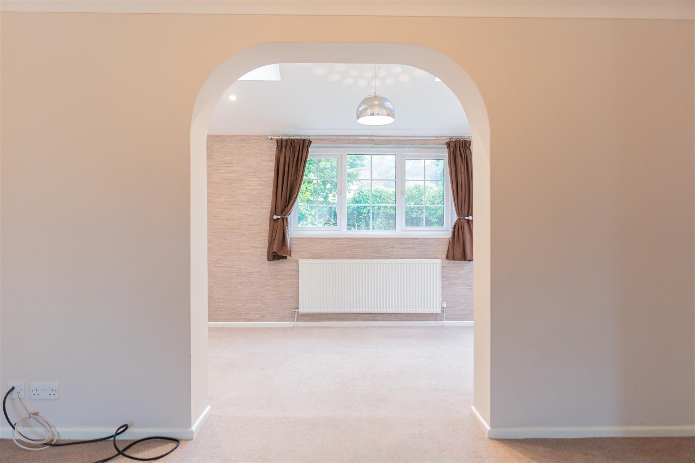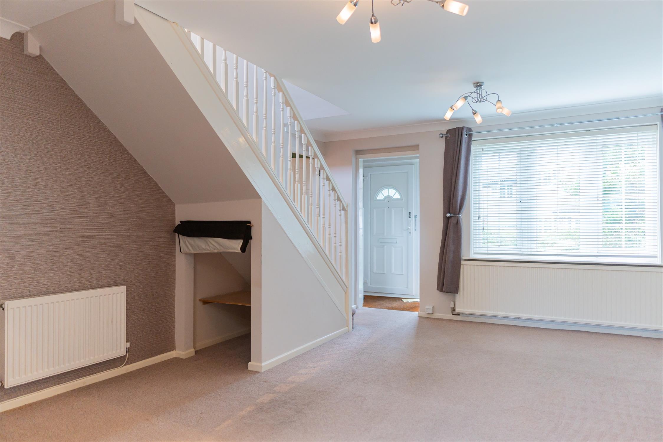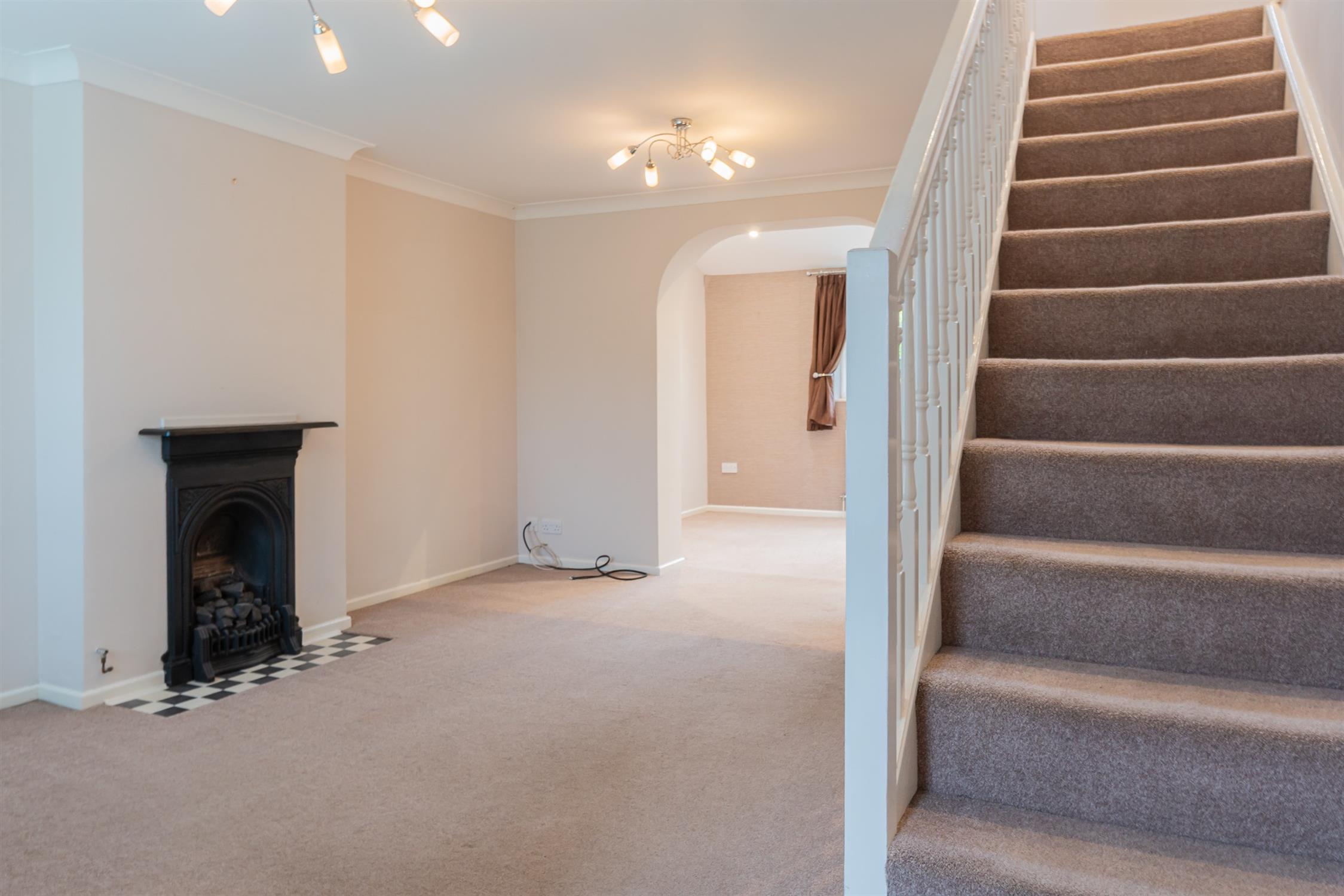 Living AreaSpacious lounge with decorative fire, under stairs storage, leading to a bright and airy dining room. Access to rear garden via French doors.