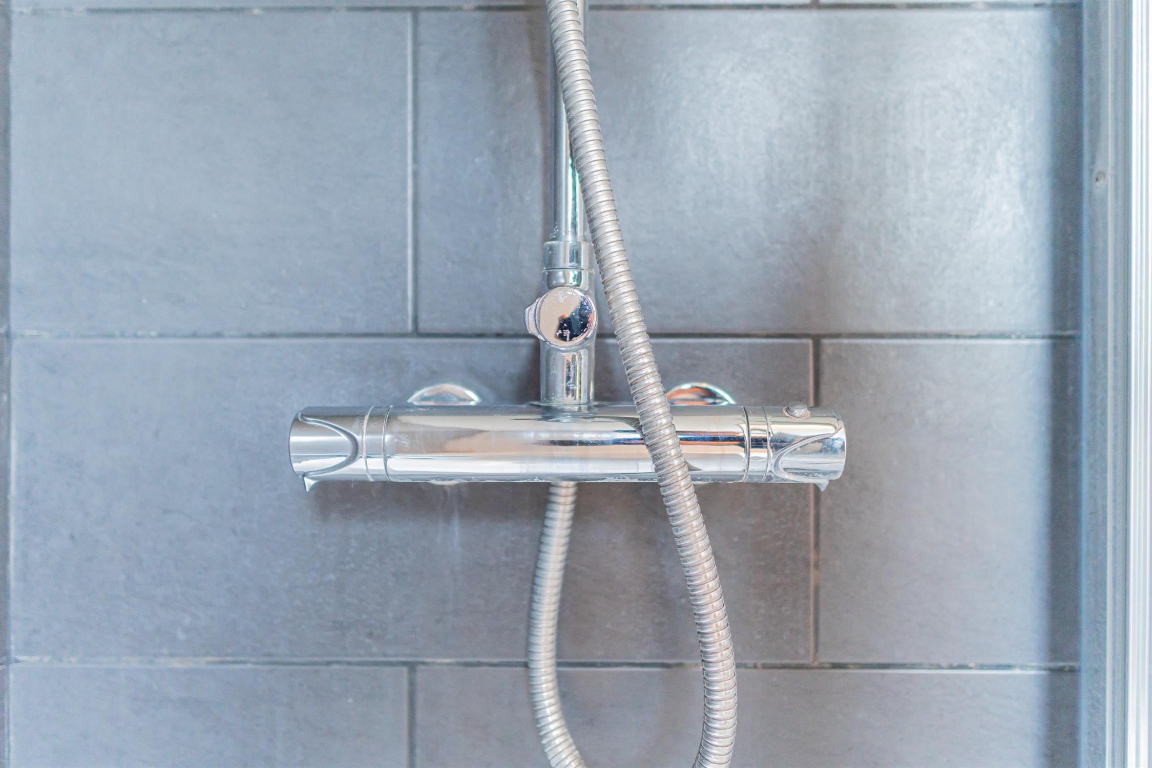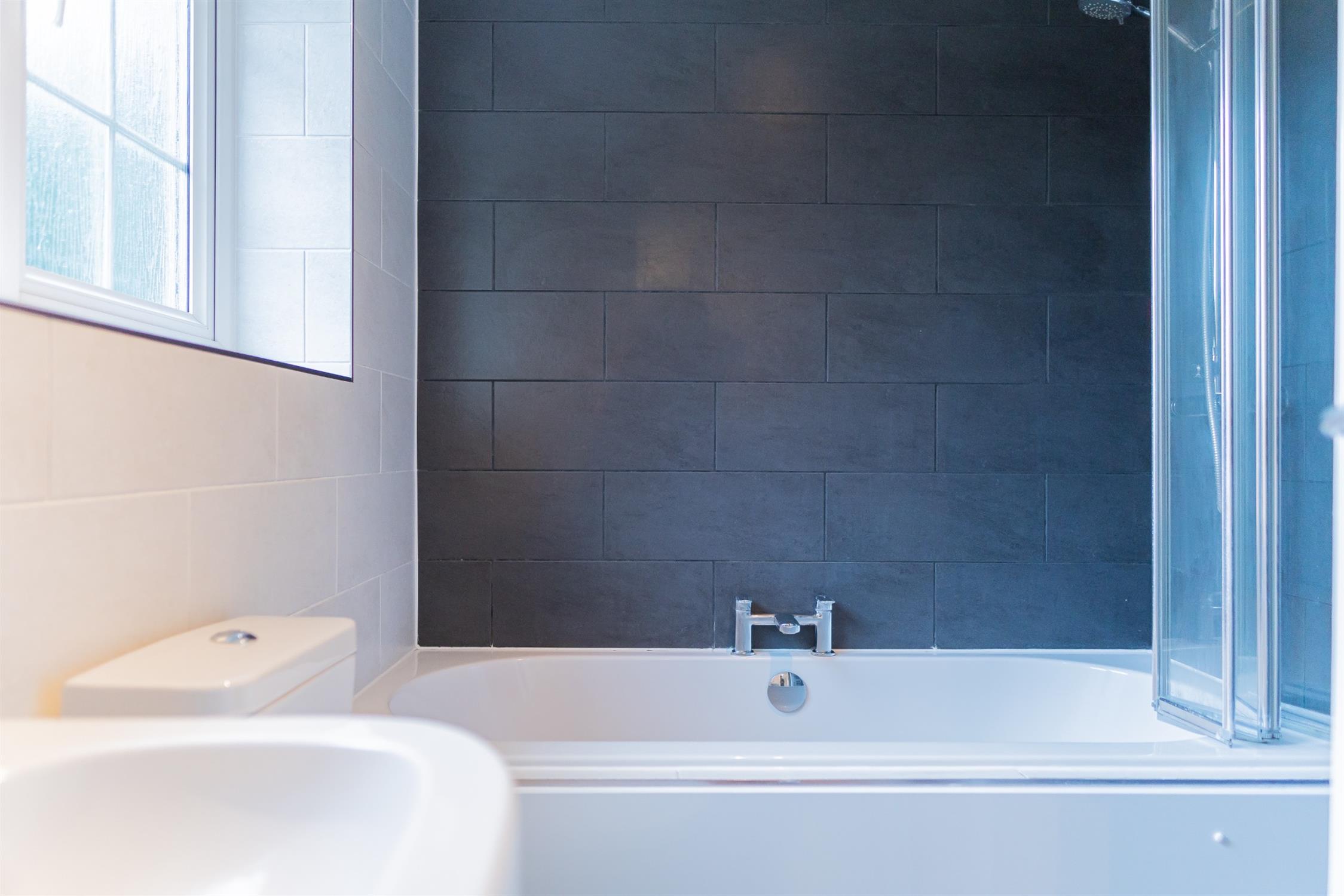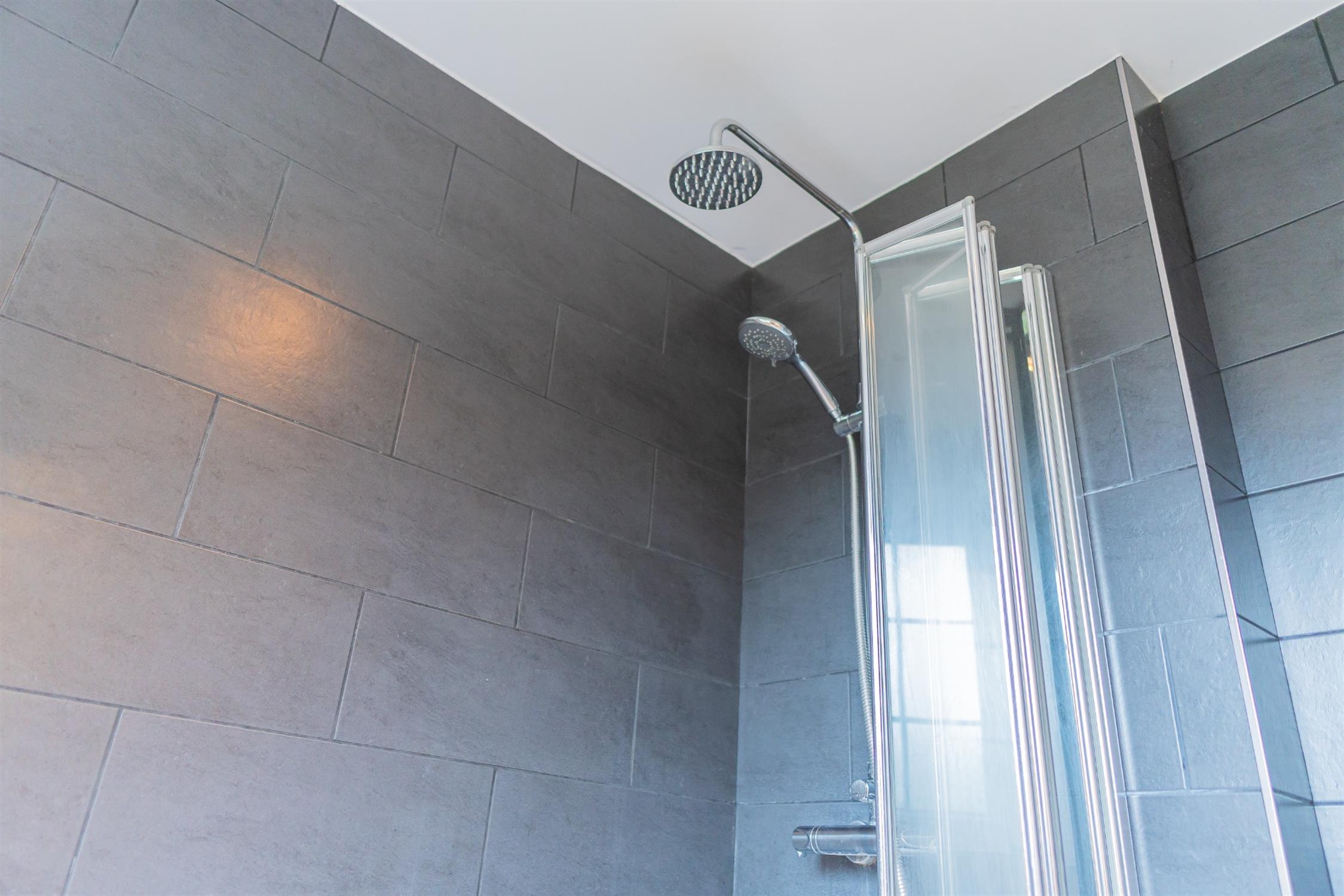 Modern bathroom with mains powered shower over a large bath. Towel rail and storage cupboard.