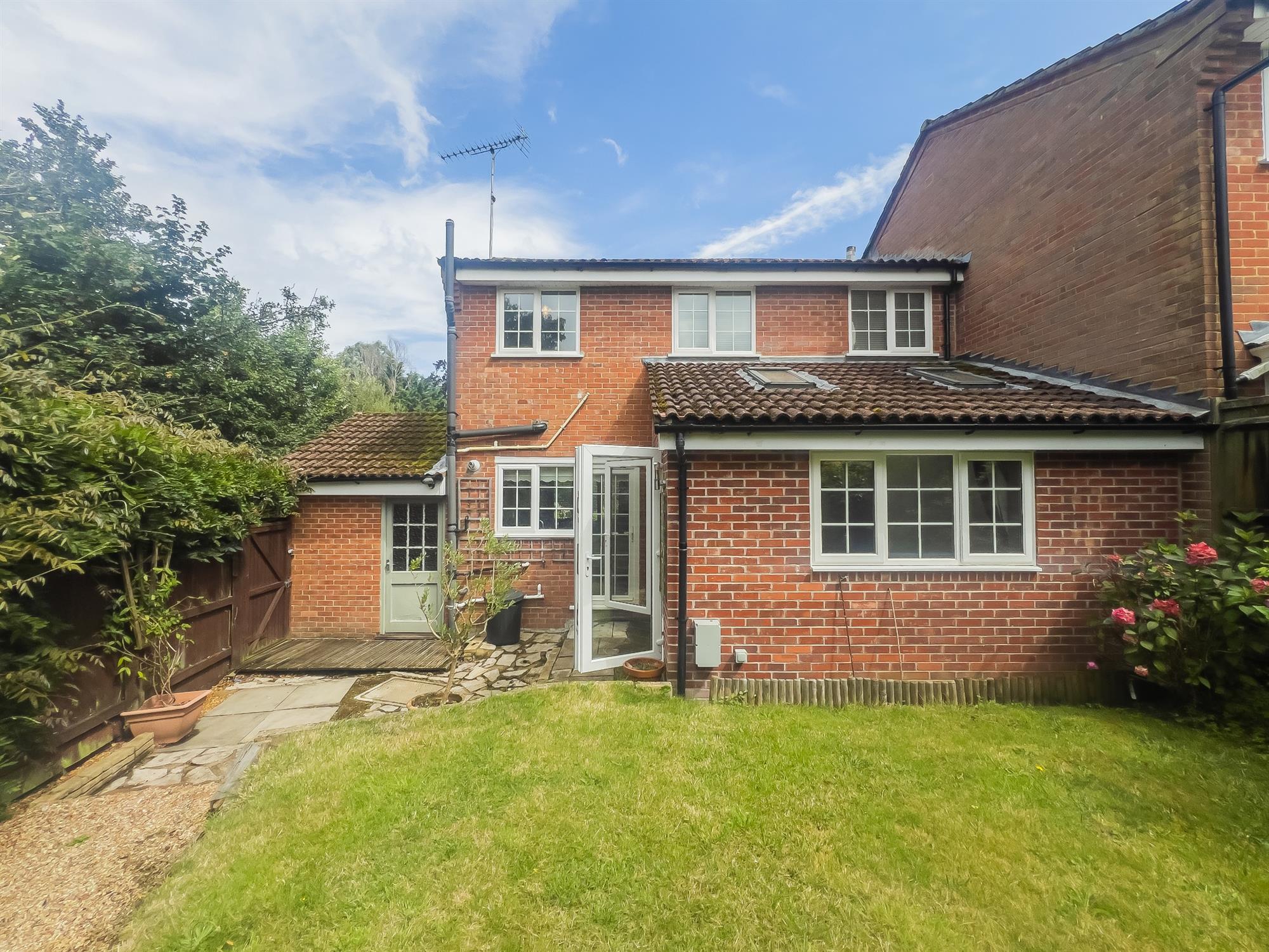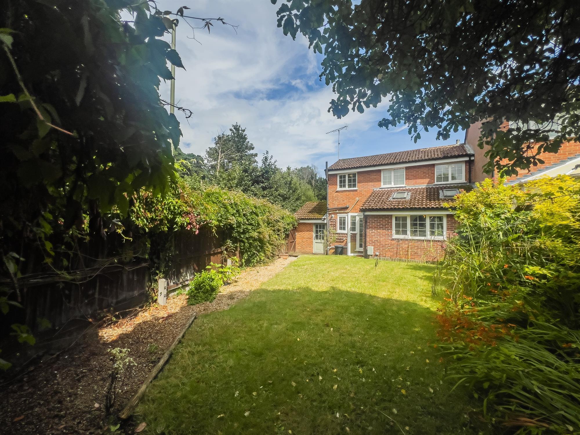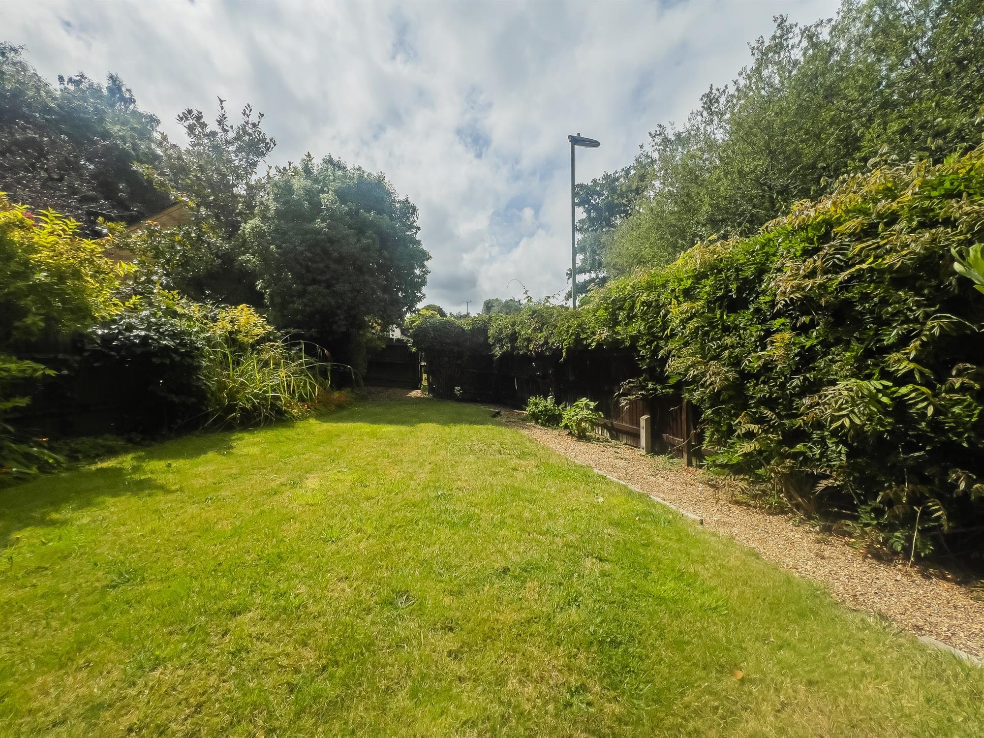 Low maintenance garden, mostly lawned. Access to road via side gate. Hedges over fences.