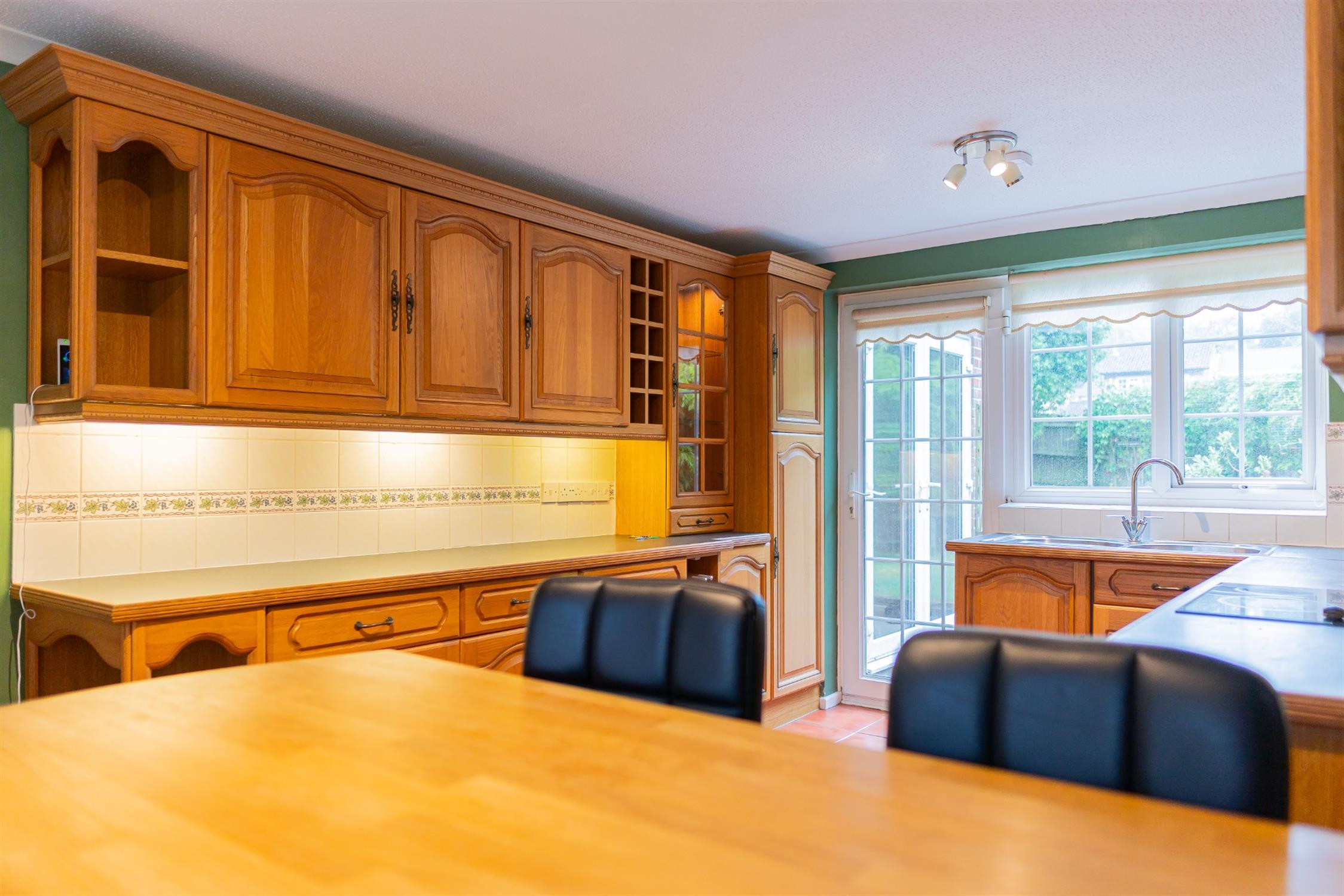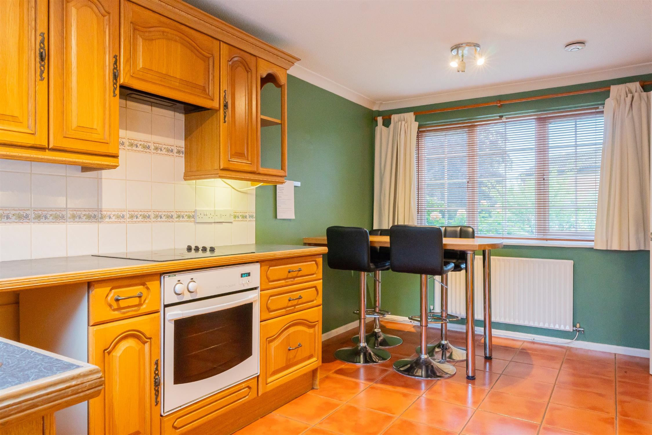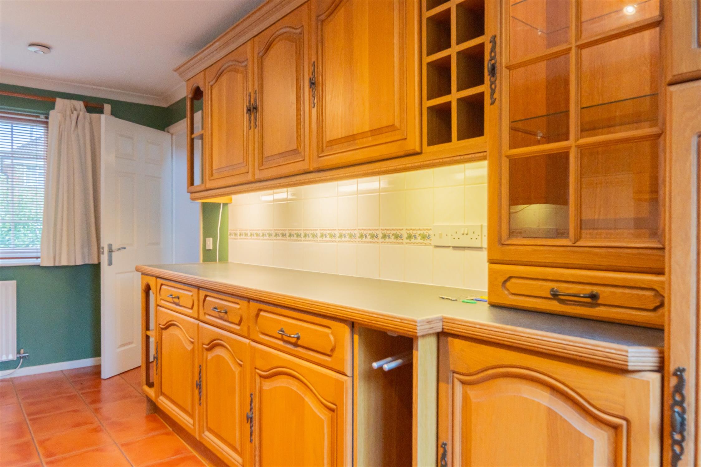 KitchenNatural wood fitted kitchen, electric oven & hob built in, under counter integrated fridge and freezer. Room for washing machine.