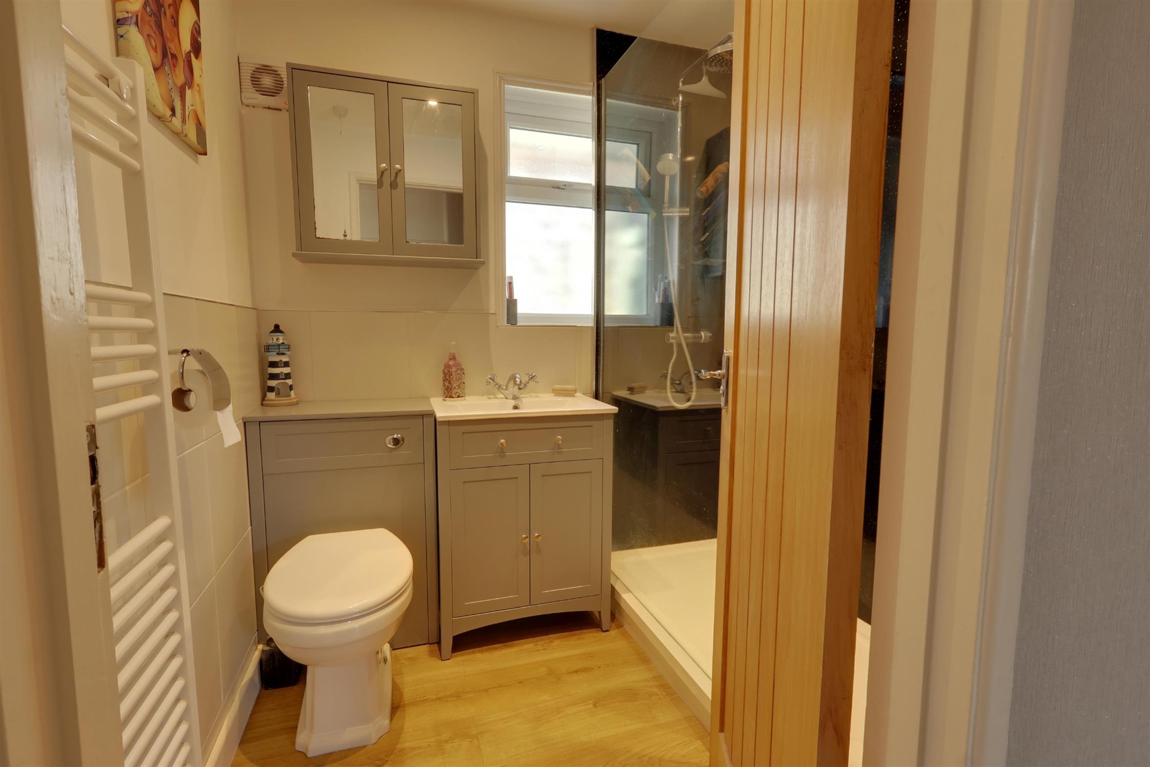 Double glazed window to side aspect. Walk-in shower with aqua panelling to walls, low level WC and wash hand basin set over vanity unit. Karndean flooring, heated towel rail.