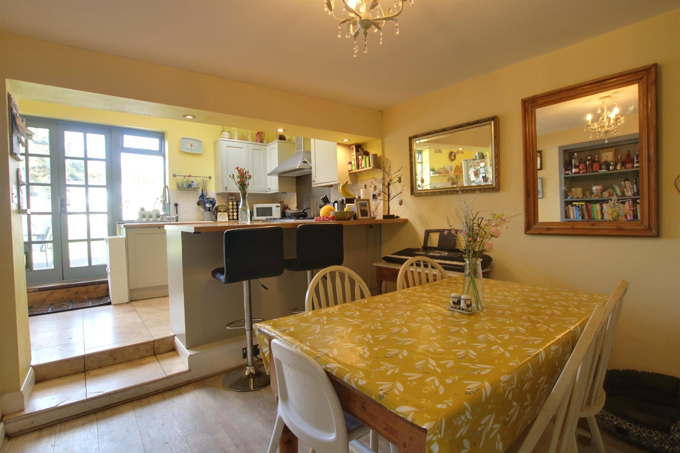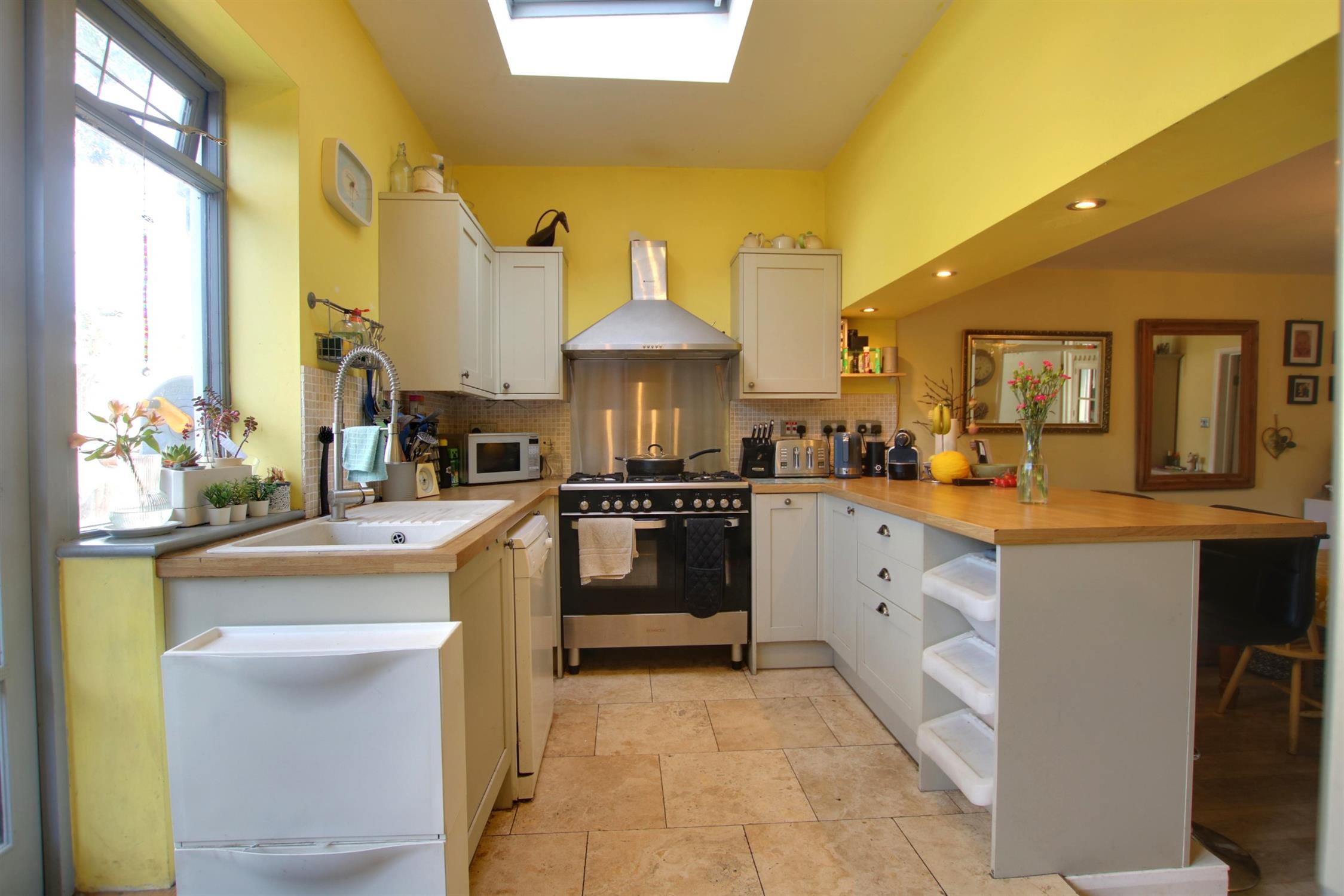 Radiator. Laminate flooring. Double glazed windows and double glazed French doors opening onto rear garden. Double glazed skylight. Smooth ceiling. Single drainer sink unit with mixer tap and cupboard under. A range of matching kitchen units. Space for range style oven with extractor over. Space and plumbing for dishwasher and washing machine. Space for tumble dryer and American style fridge/freezer. Tiled flooring. Radiator.