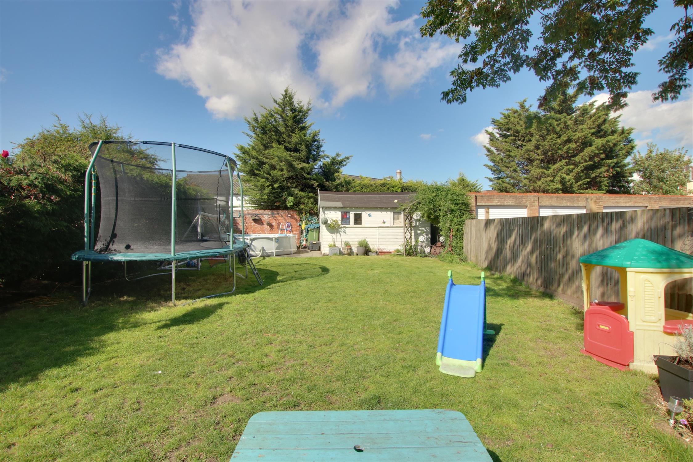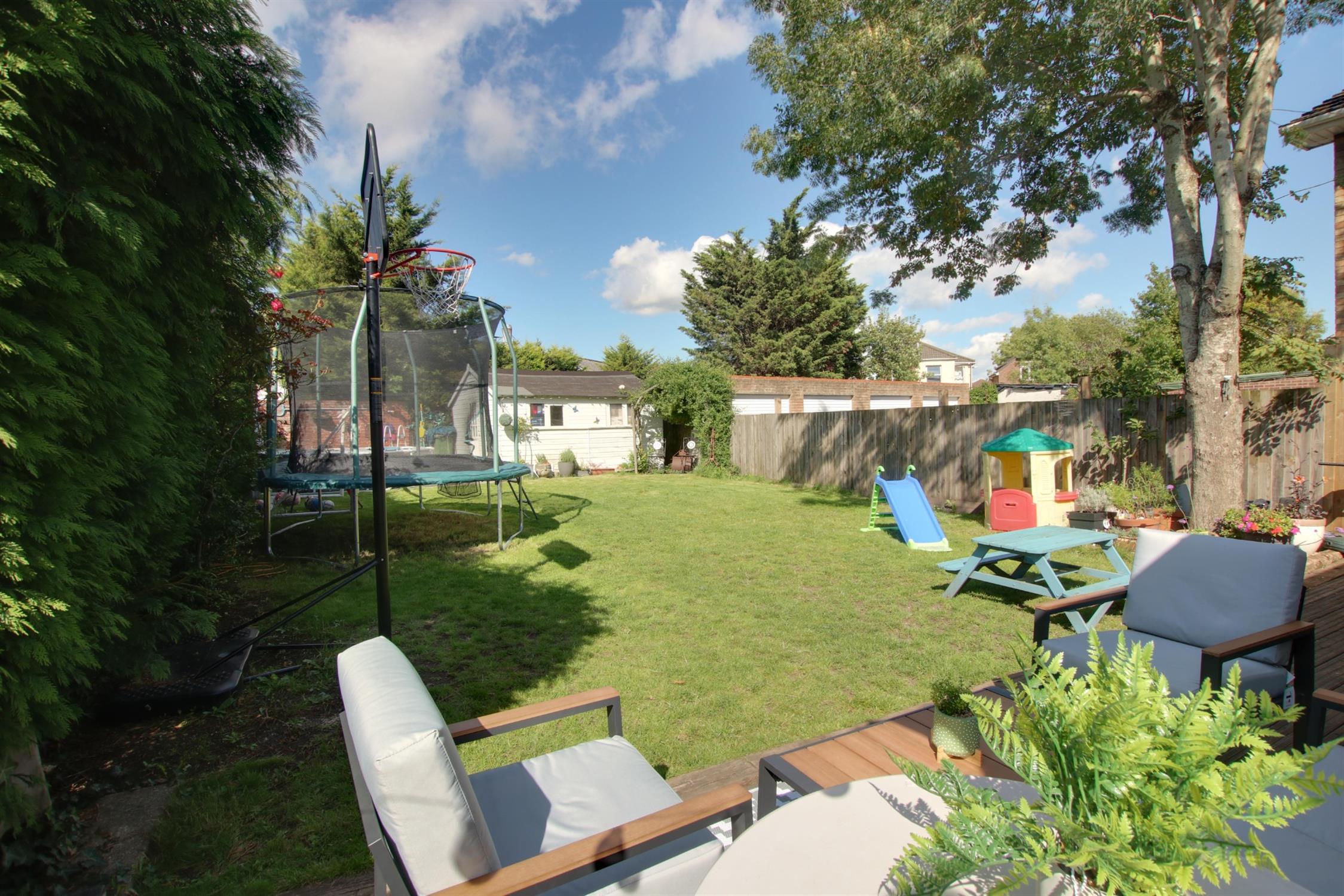 Fully enclosed private rear garden with side pedestrian access. Decked patio seating area. There is a further paved patio seating area to the rear of the garden with a large garden shed. The remainder of the garden is principally laid to lawn.
