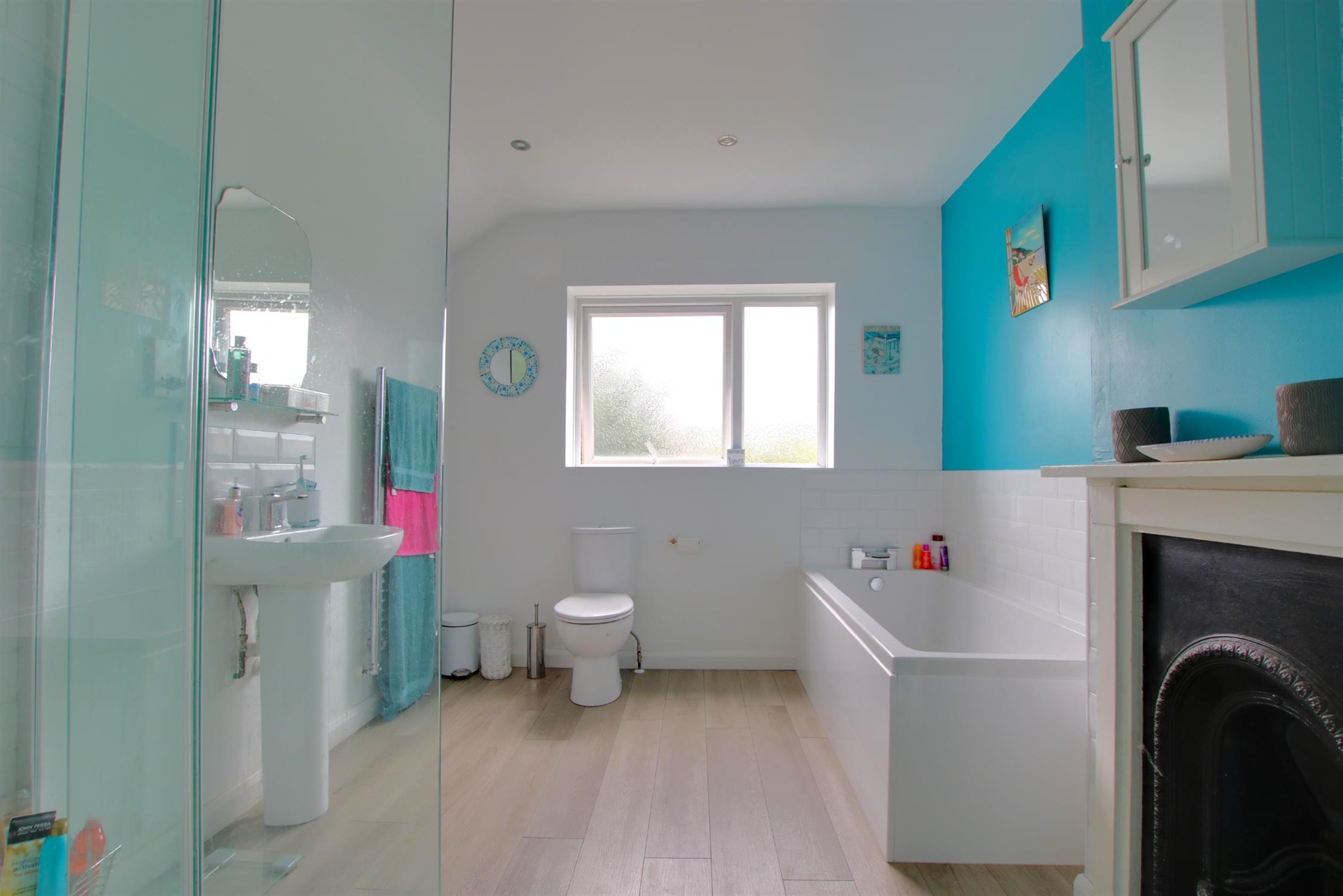 Laminate flooring. Feature fireplace Partially tiled walls. Walk in shower. Extractor fan. Panel enclosed bath. Low level W.C and basin. Storage cupboard. Obscure double-glazed window to rear aspect. Heated towel rail.