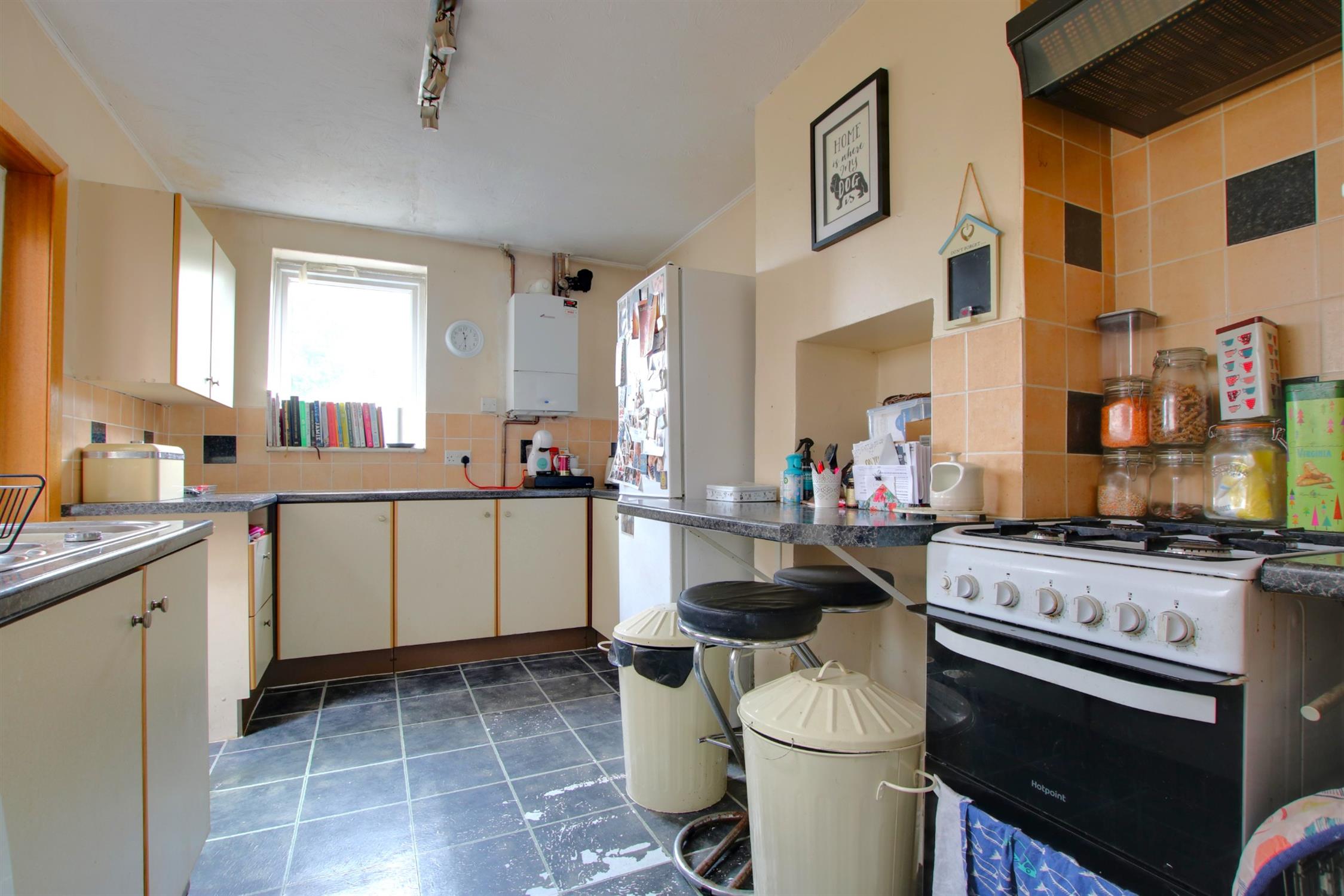Laminate flooring. Tiled splashback. Matching wall and base units. Inset stainless steel sink. Space for cooker, washing machine and fridge-freezer. Wall mounted combination boiler. Double-glazed windows to side and rear aspect. Door to garden.