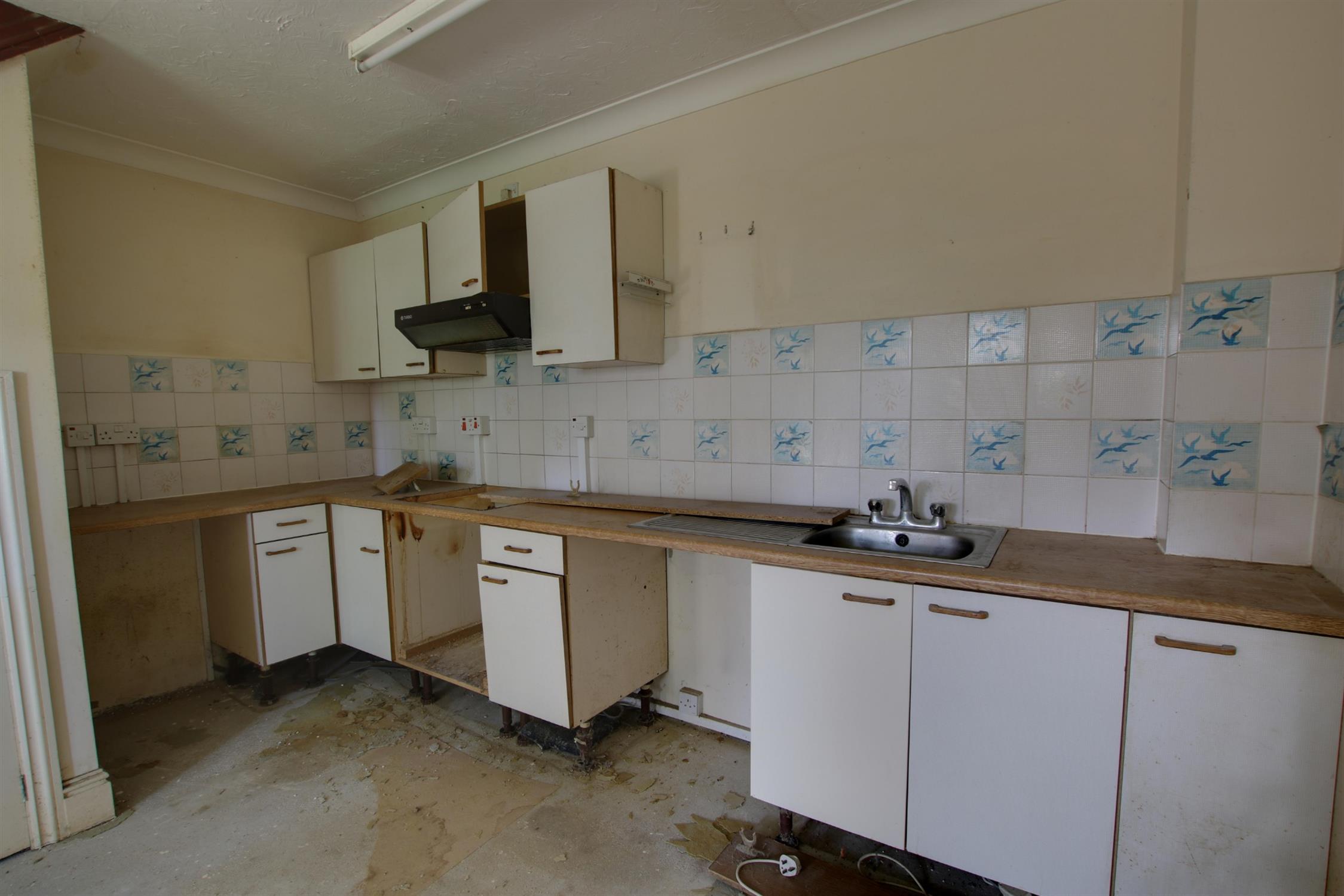 Matching wall and base units with tiled splashback. Stainless steel sink. Space for appliances.