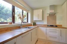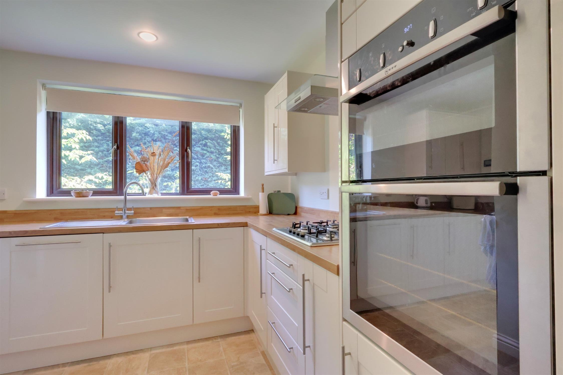 UPVC window and rear aspect. Doors leading to rear patio. Range of light coloured wall and floor cupboards with drawer units. Built-in electric oven and gas hob with extractor above. Tiled splashback. Integrated fridge and freezer. Sink and drainer with central mixer tap set into worktop. Door to: