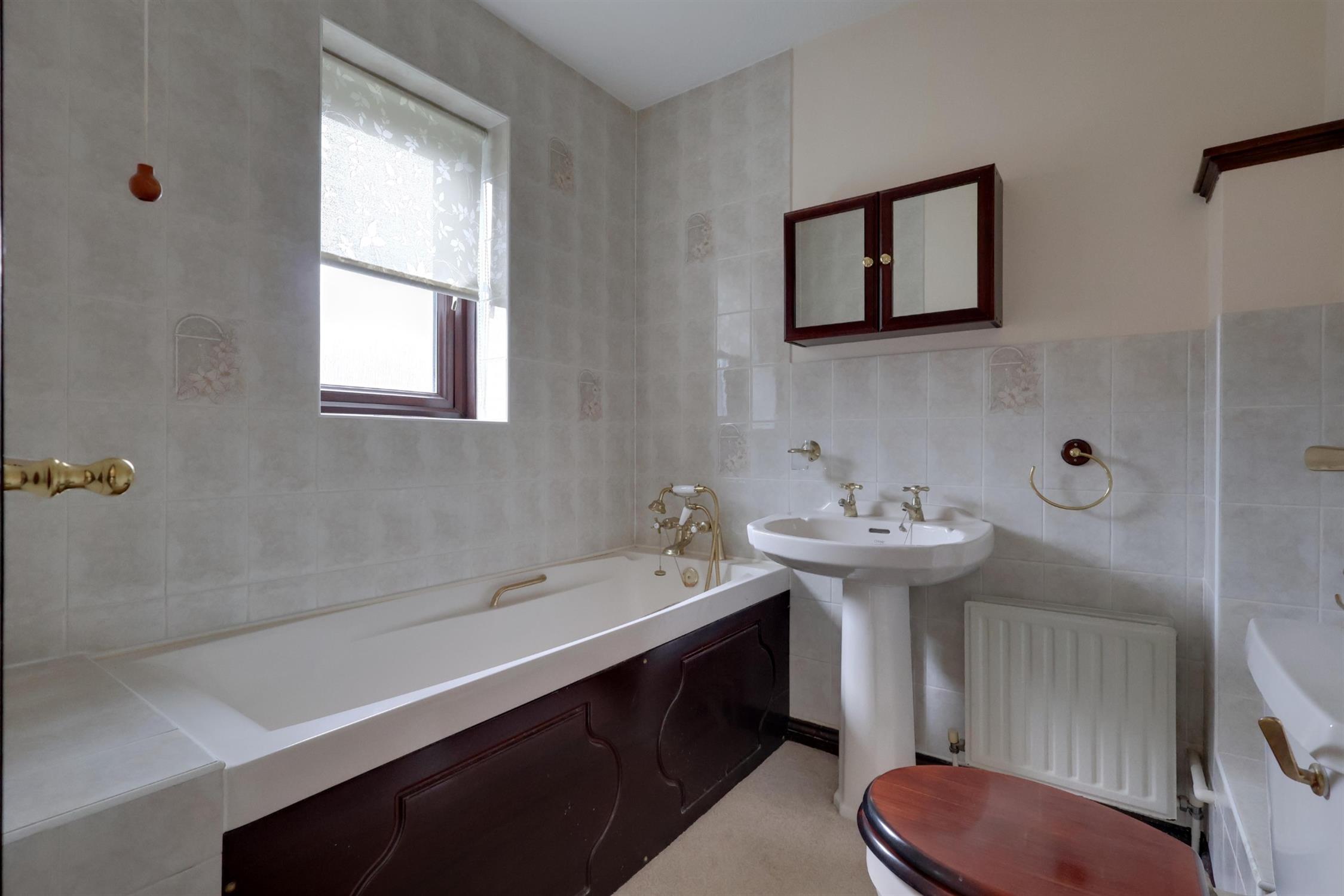 Textured ceiling. Frosted uPVC window to rear aspect. Close coupled WC, panelled bath with central mixer tap.